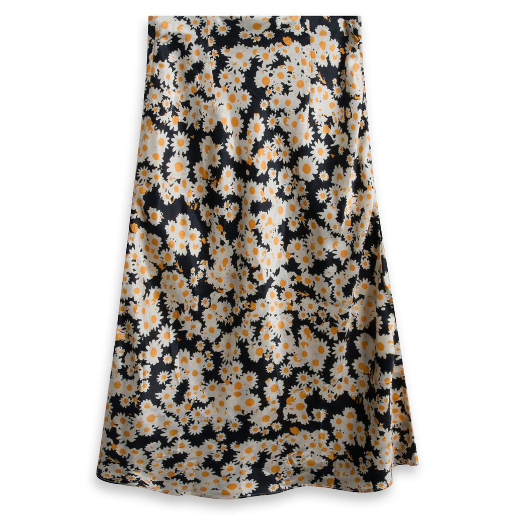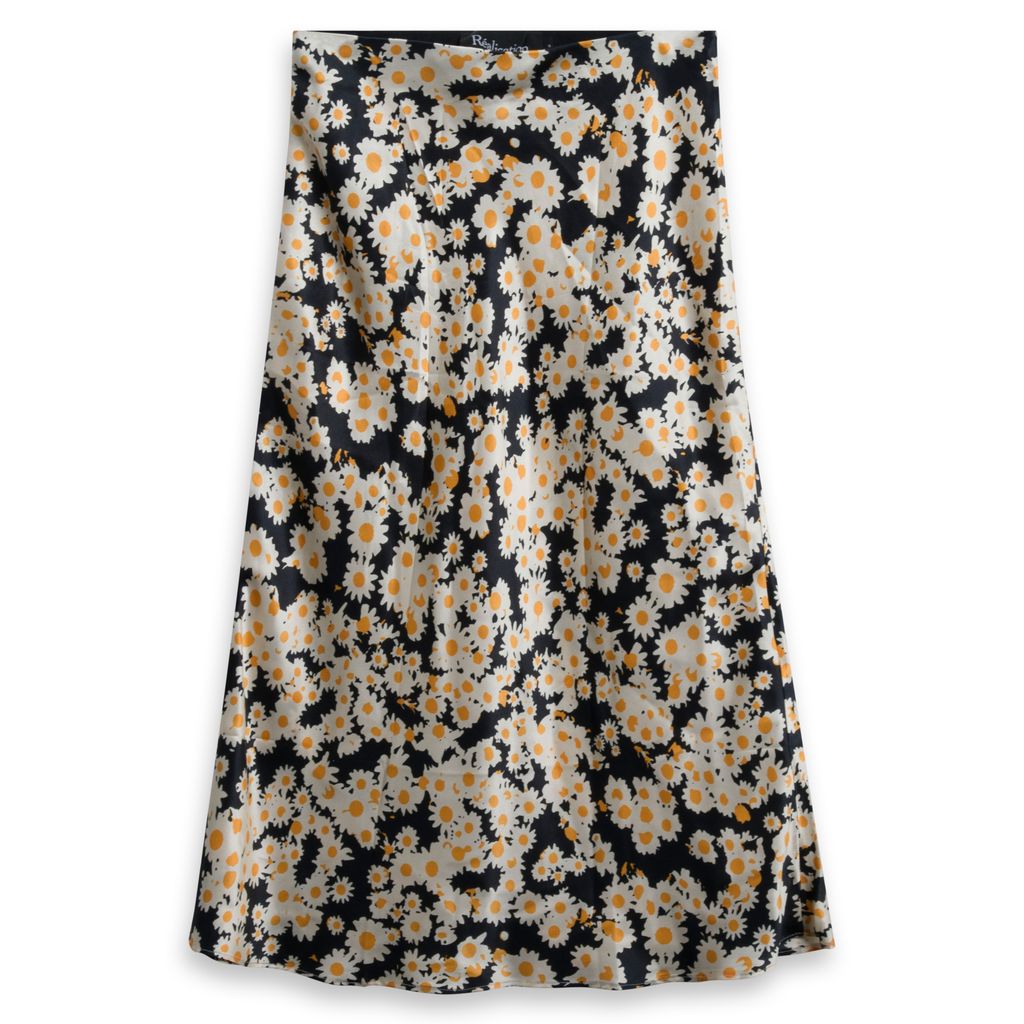 This bias-cut silk skirt features a ¾ length slip style with a hidden elastic waistband. Can be worn on the waist or on the hip. In excellent condition.