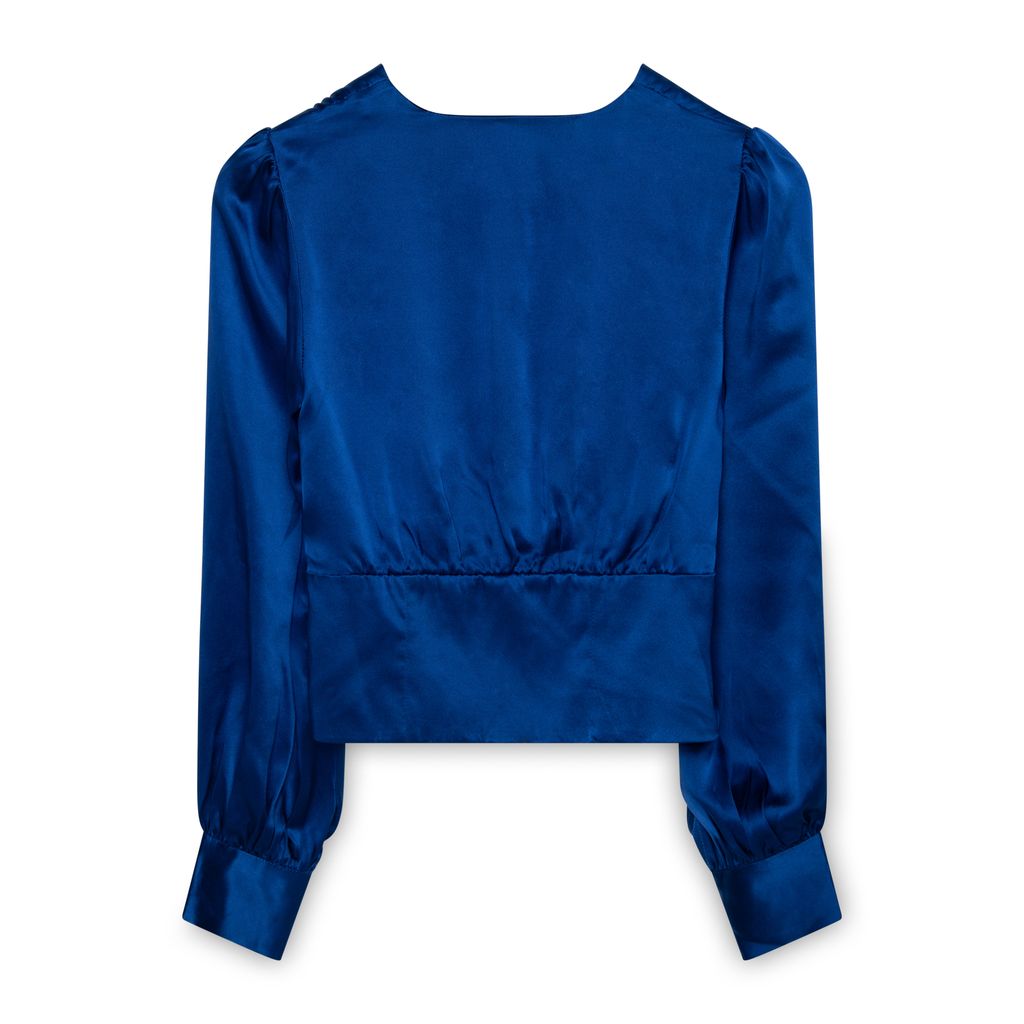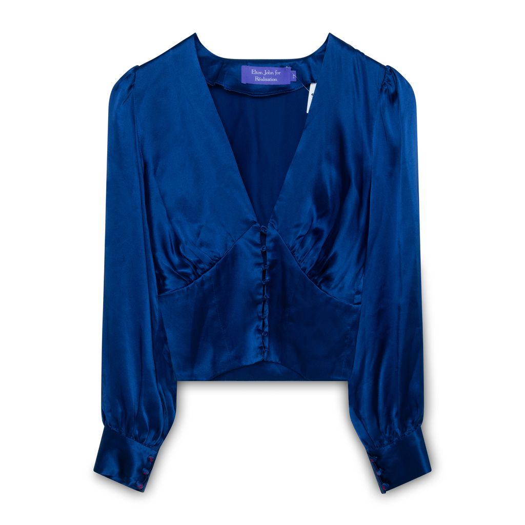 Realisation x Elton John The Bennie in Blue features top with lace up front, slightly puffed sleeves with cuffs and cropped fit, and maxi skirt with hidden side zip.