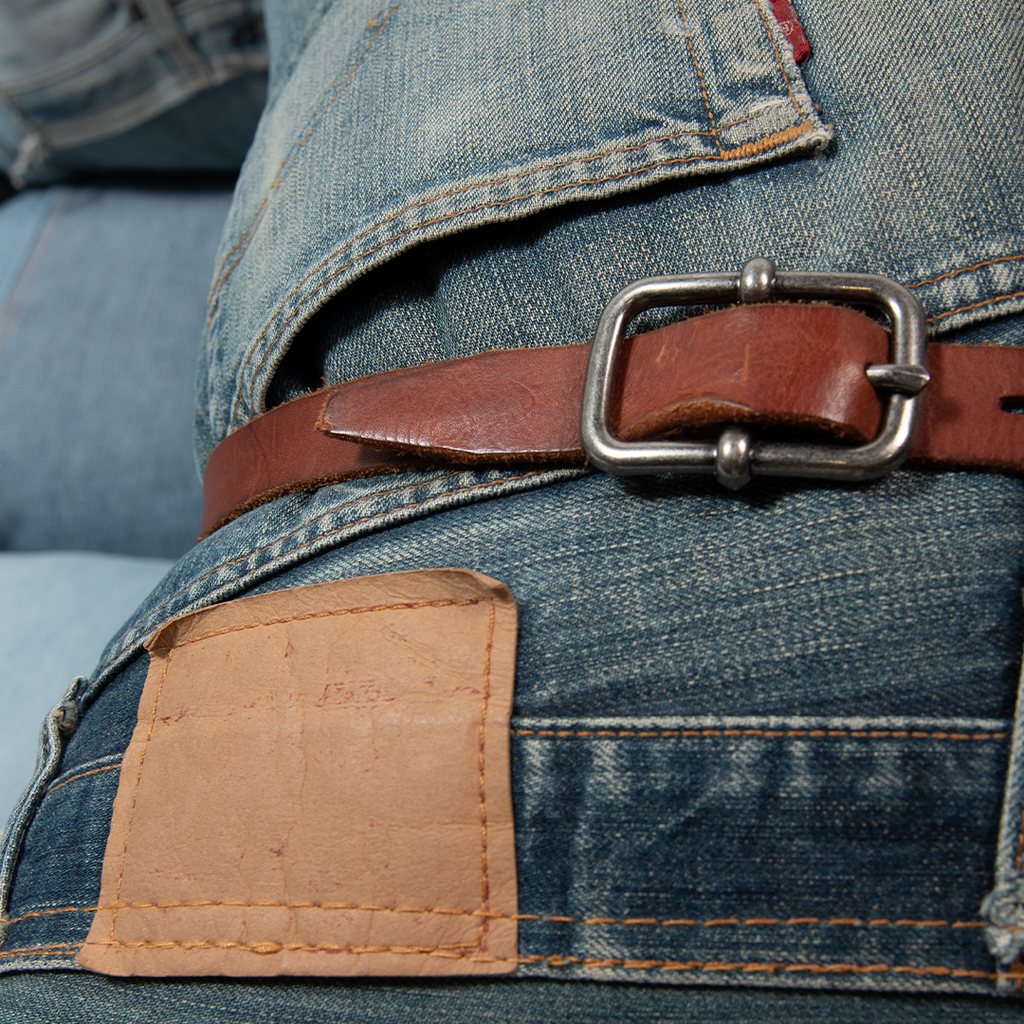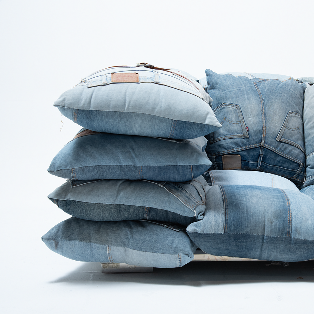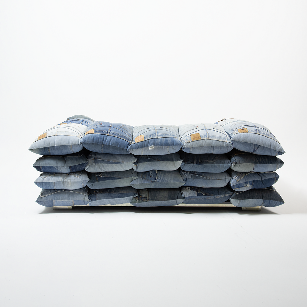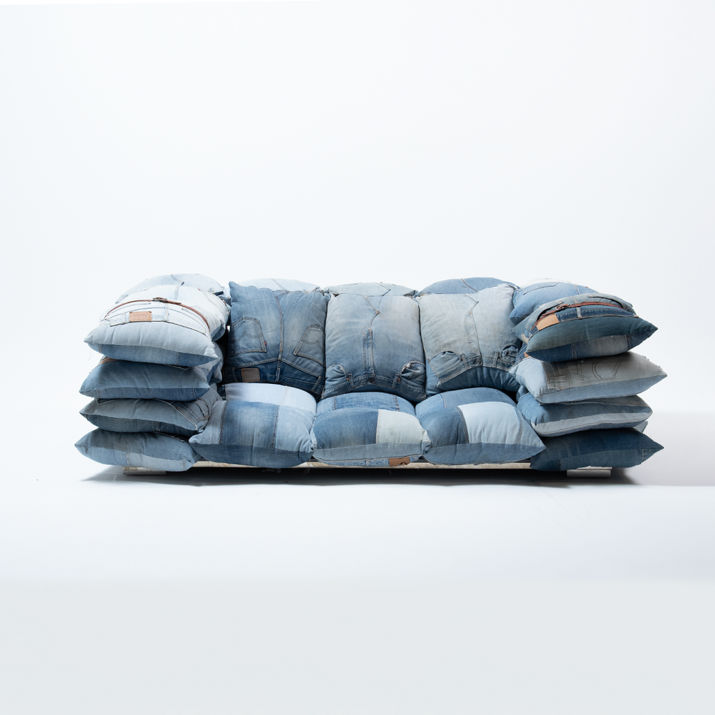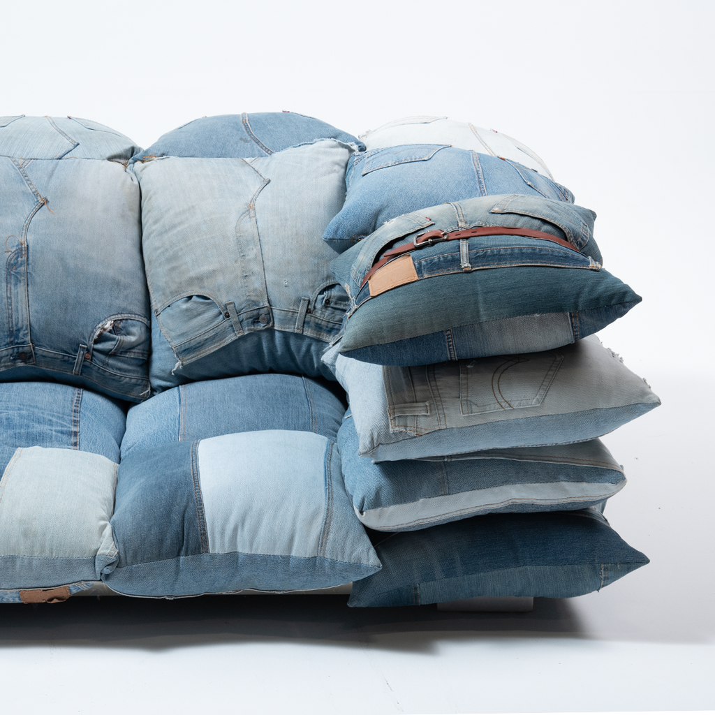 Recycled Levi's Denim Two Seat Sofa features stainless steel frame and recycled Levi's cushions.