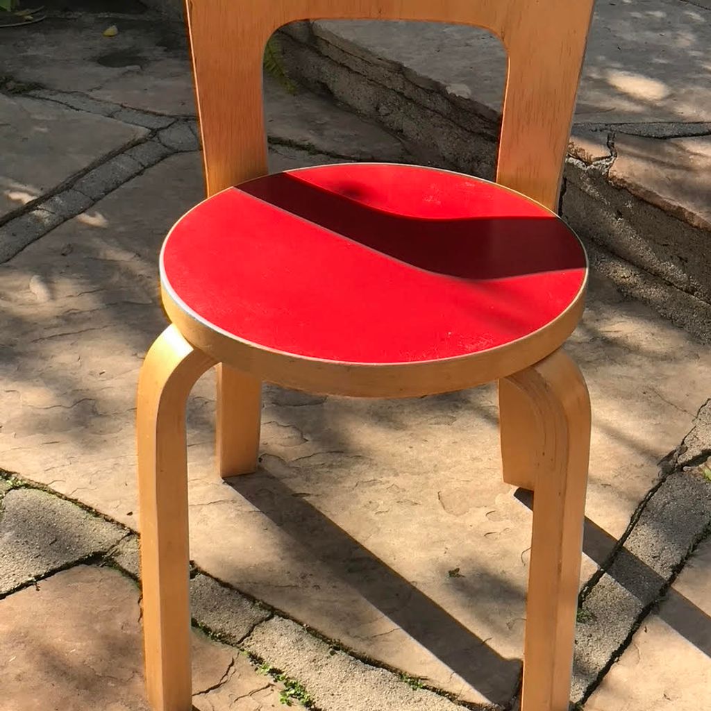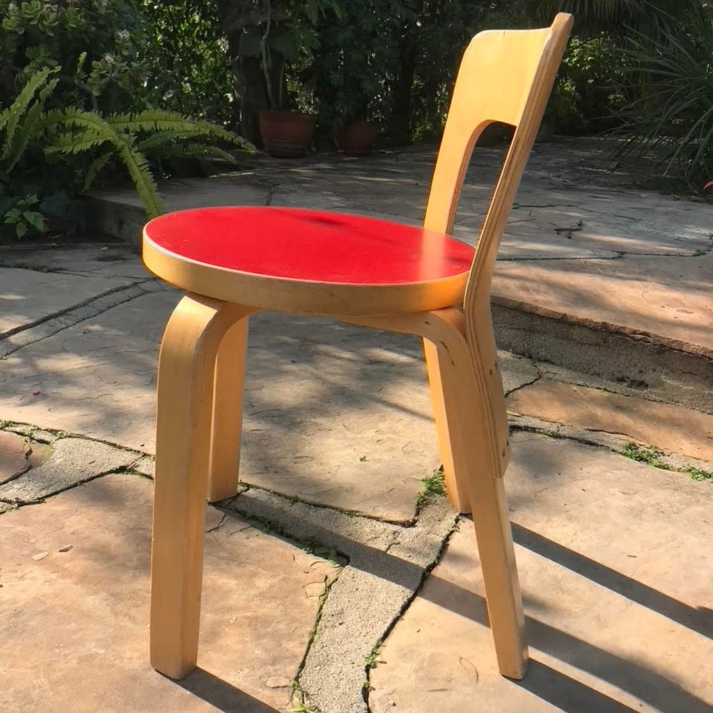The height of the backrest allows for the chair to be pushed under a table or desk. The distinctive circular seat and L-shaped legs are part of Alvar Aalto's standardized system of components.
