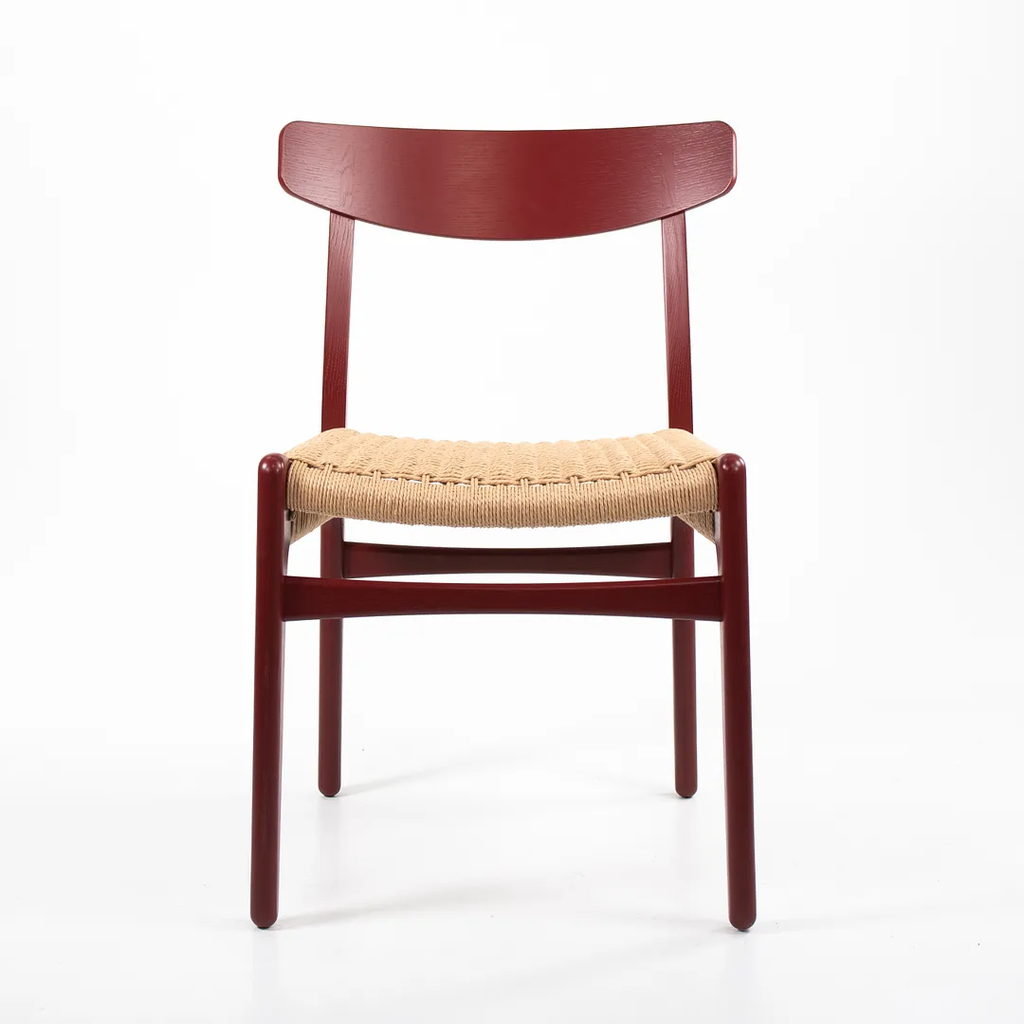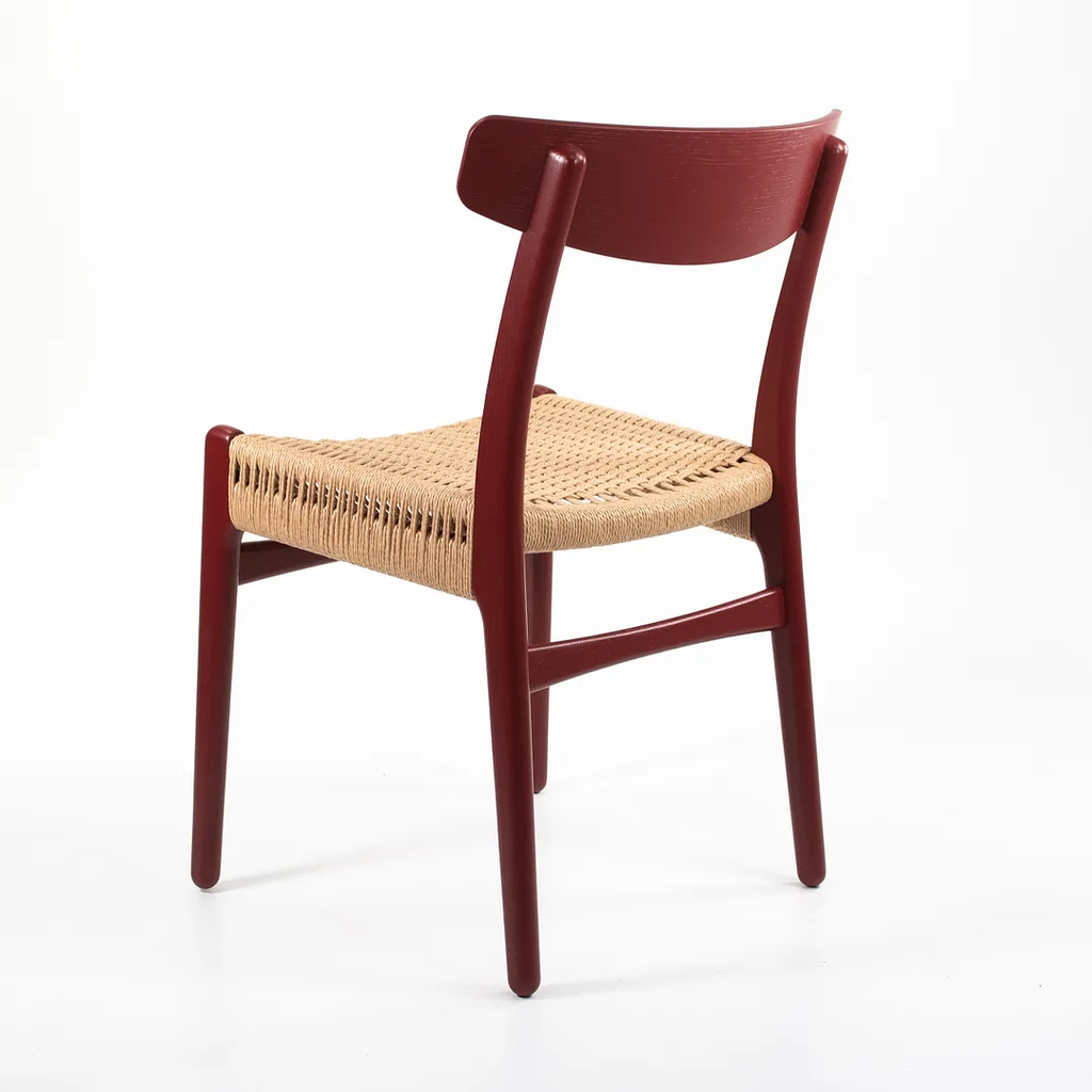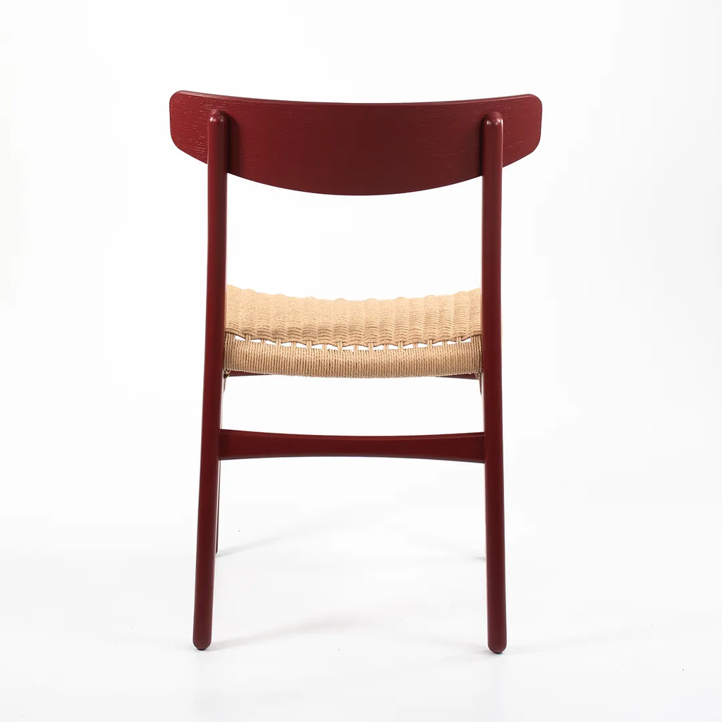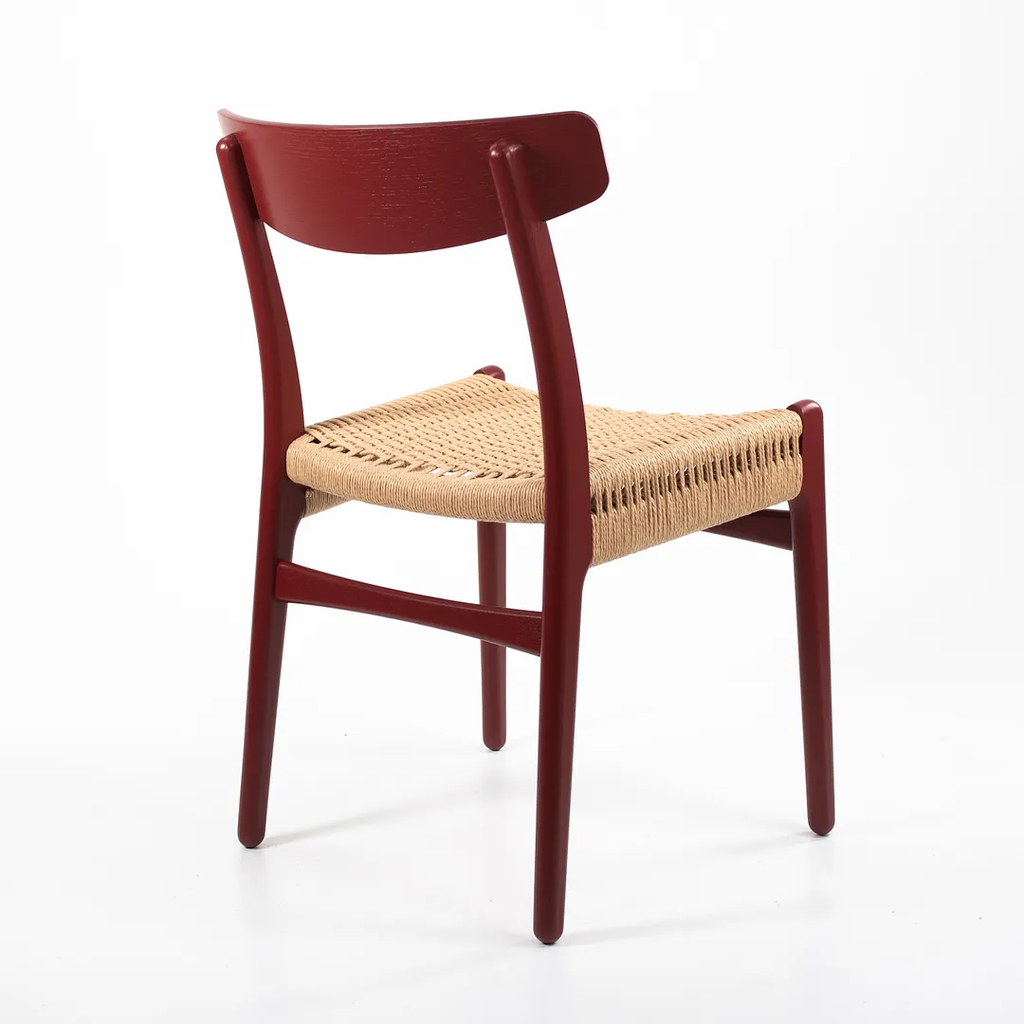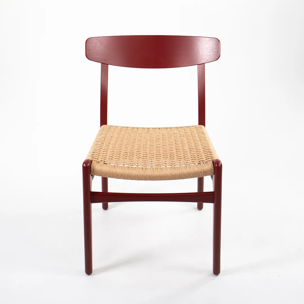 Listed for sale is a CH23 Dining Chair designed by Hans Wegner and produced by Carl Hansen & Son in Denmark. The chair is made with a solid oak frame, painted red (we believe. it to be Falu red, though do not guarantee it), with a natural paper cord seat. The chair dates to circa 2021 and is guaranteed as authentic. Condition is excellent with only minimal wear. See photos. This came directly to us from Carl Hansen and was likely never used in a home or office setting.