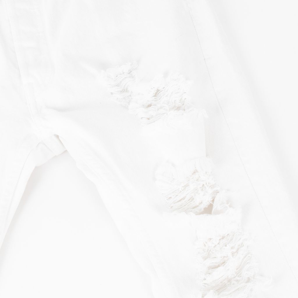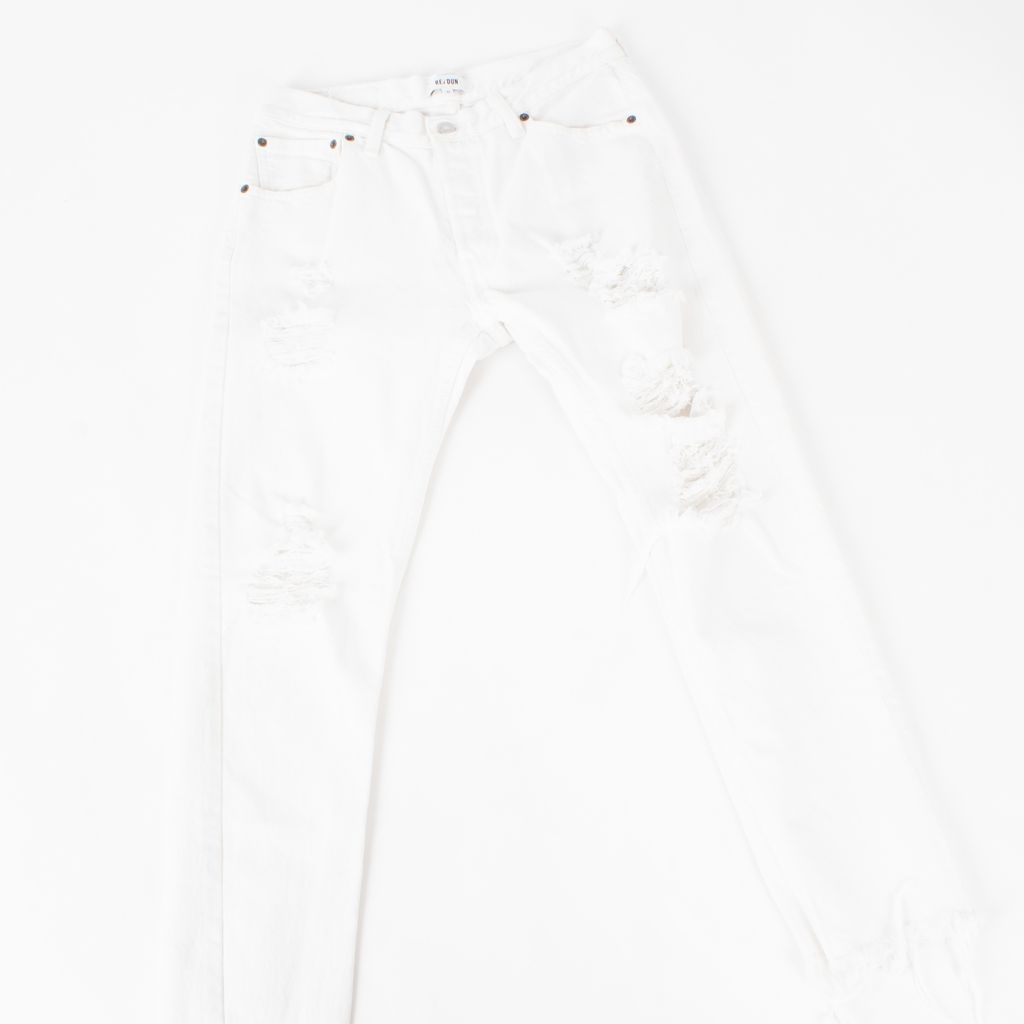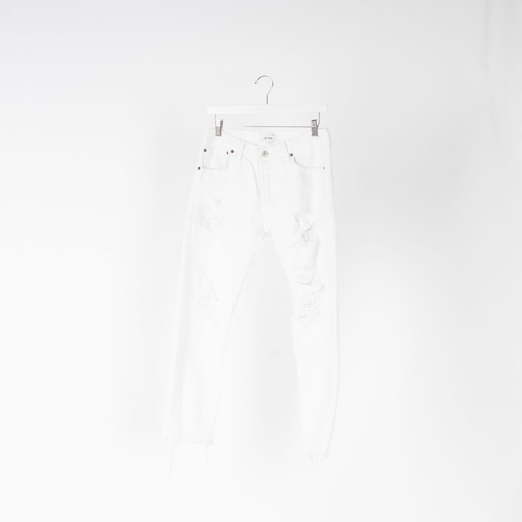 From Levi's partner brand Re/Done, come these shredded straight leg jeans in an optic white. Features high rise silhouette, stovepipe leg shape, hyper distressing from top of thighs to knees, cropped raw hem ankles, Re/Done leather back patch, and pockets on front and back.