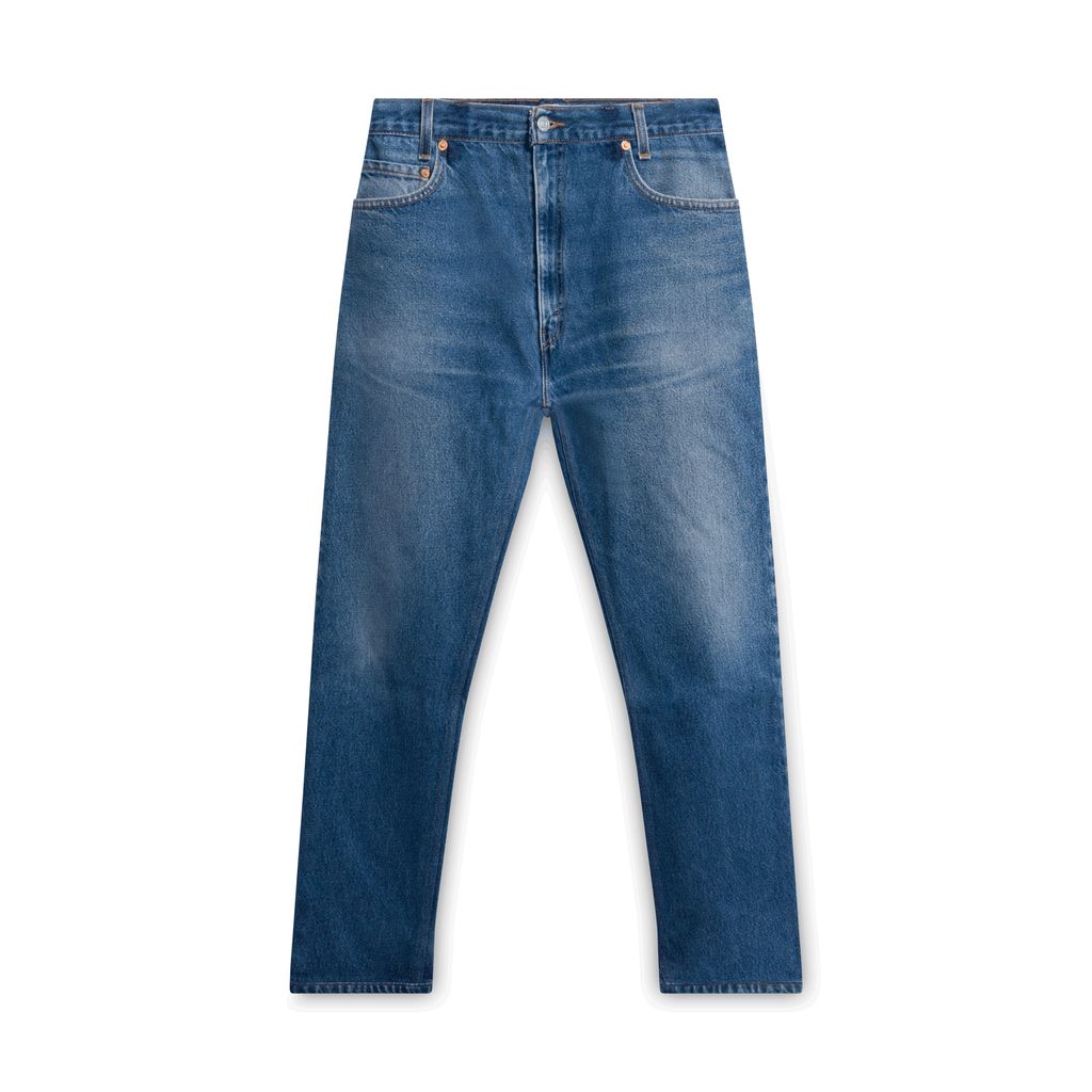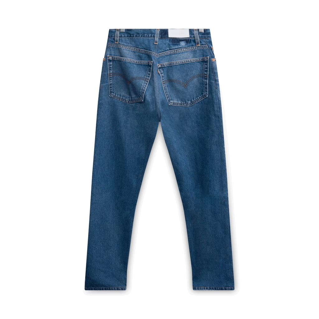 Blue Jeans with two large pockets in the front and back. Backside features sewn white leather tag with RE/DONE and Levis brand logos engraved.