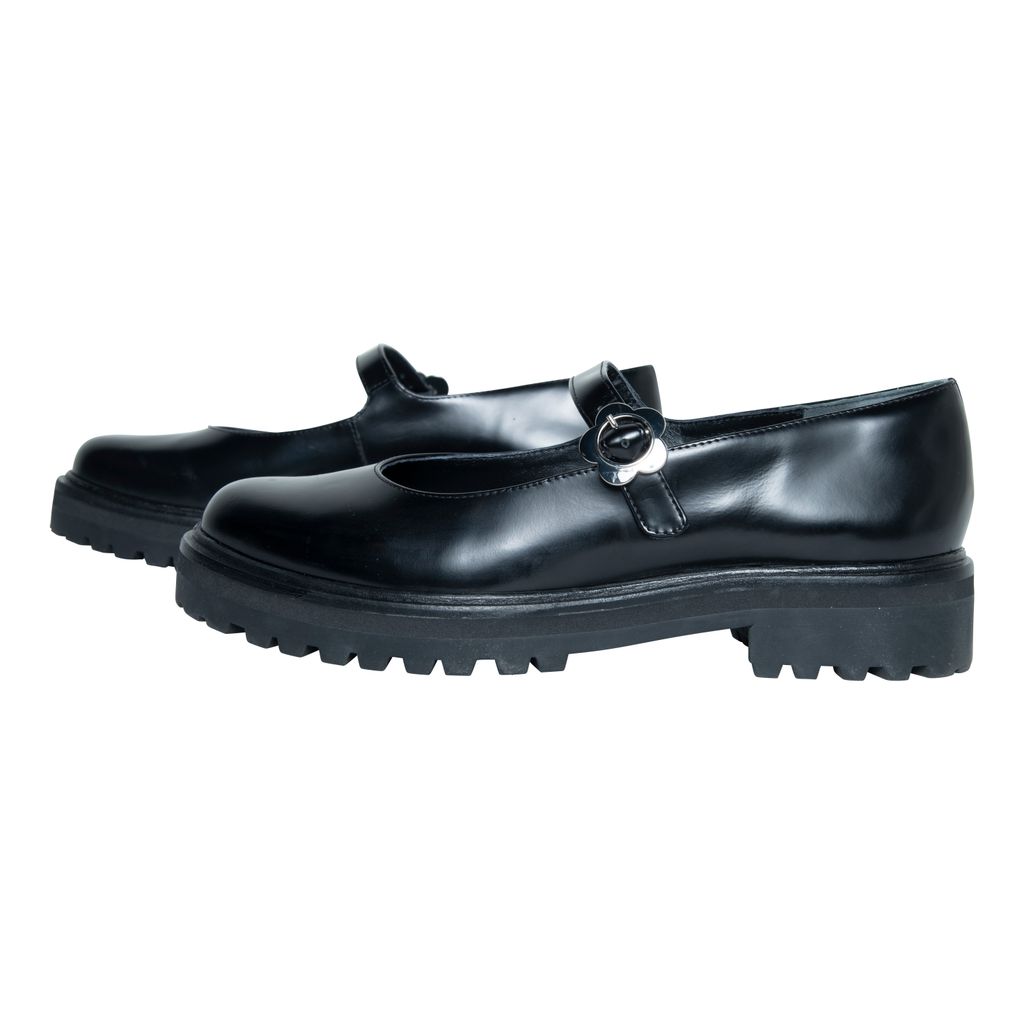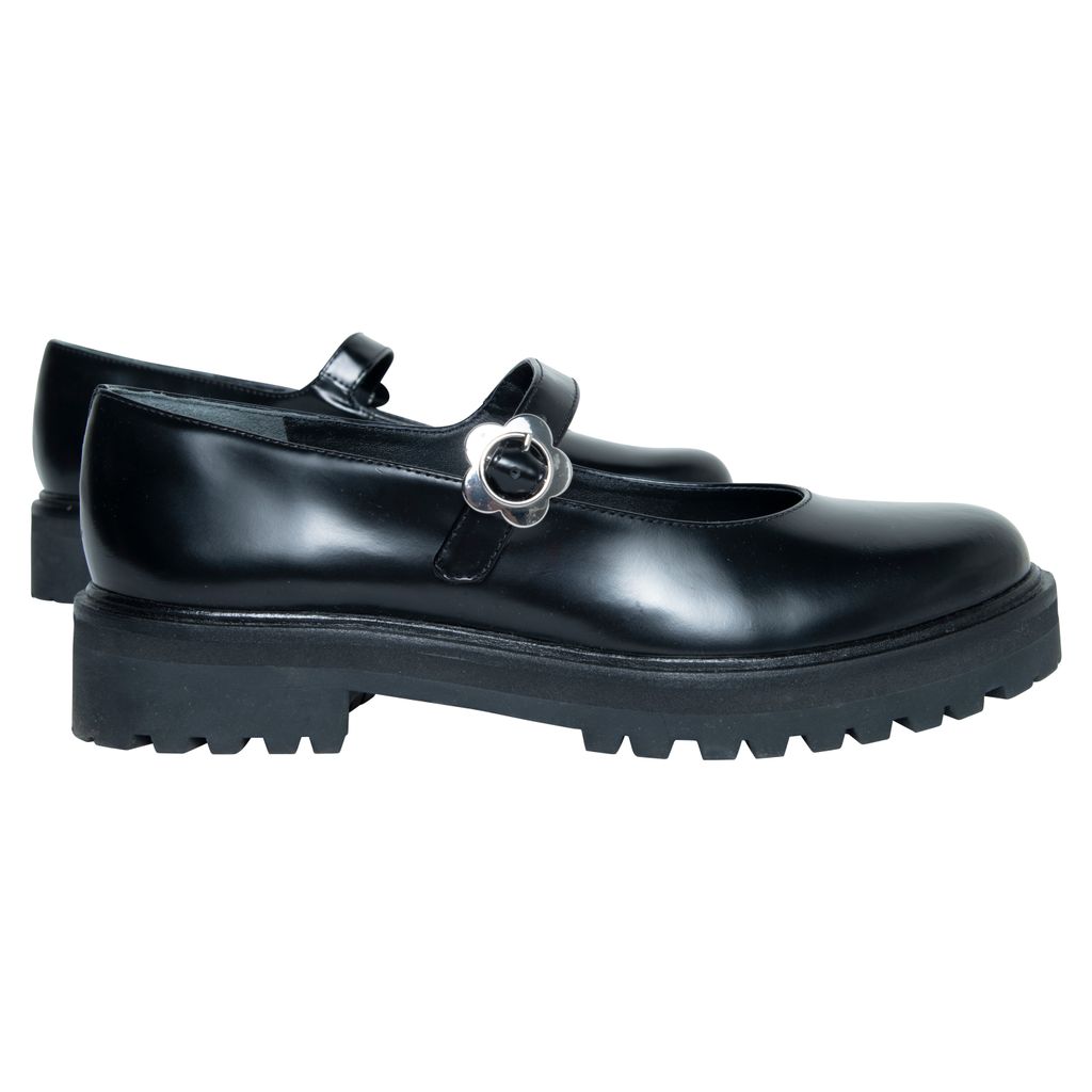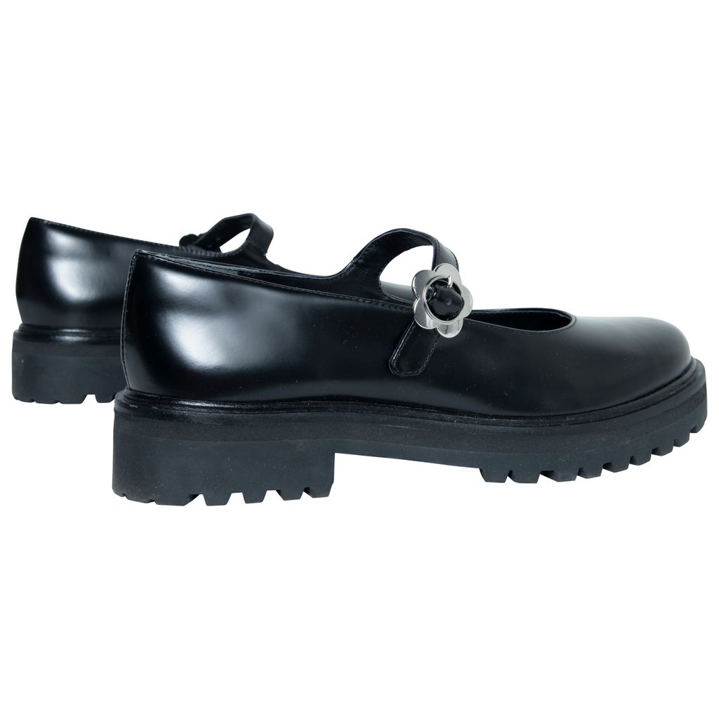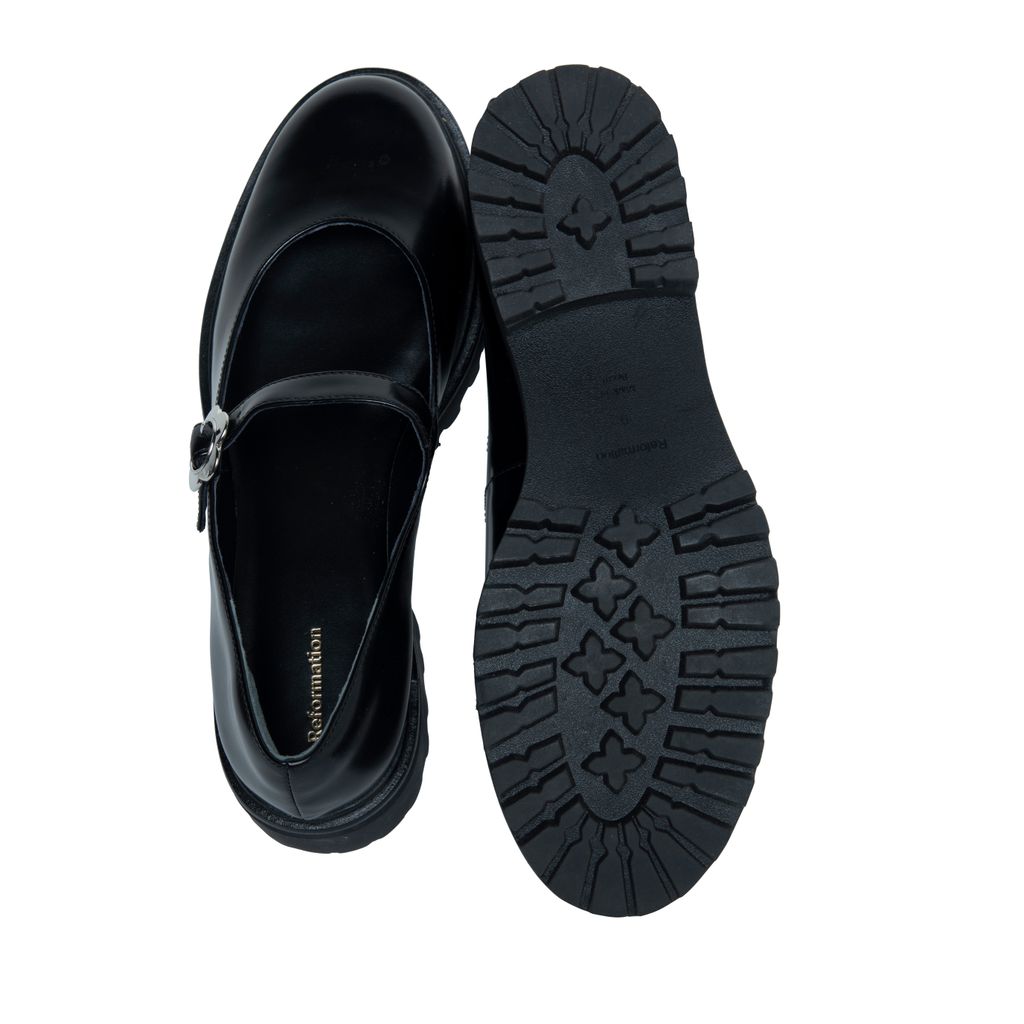 Reformation Adalynn Chunky Maryjane features lug sole, floral buckle detail, and round toe.