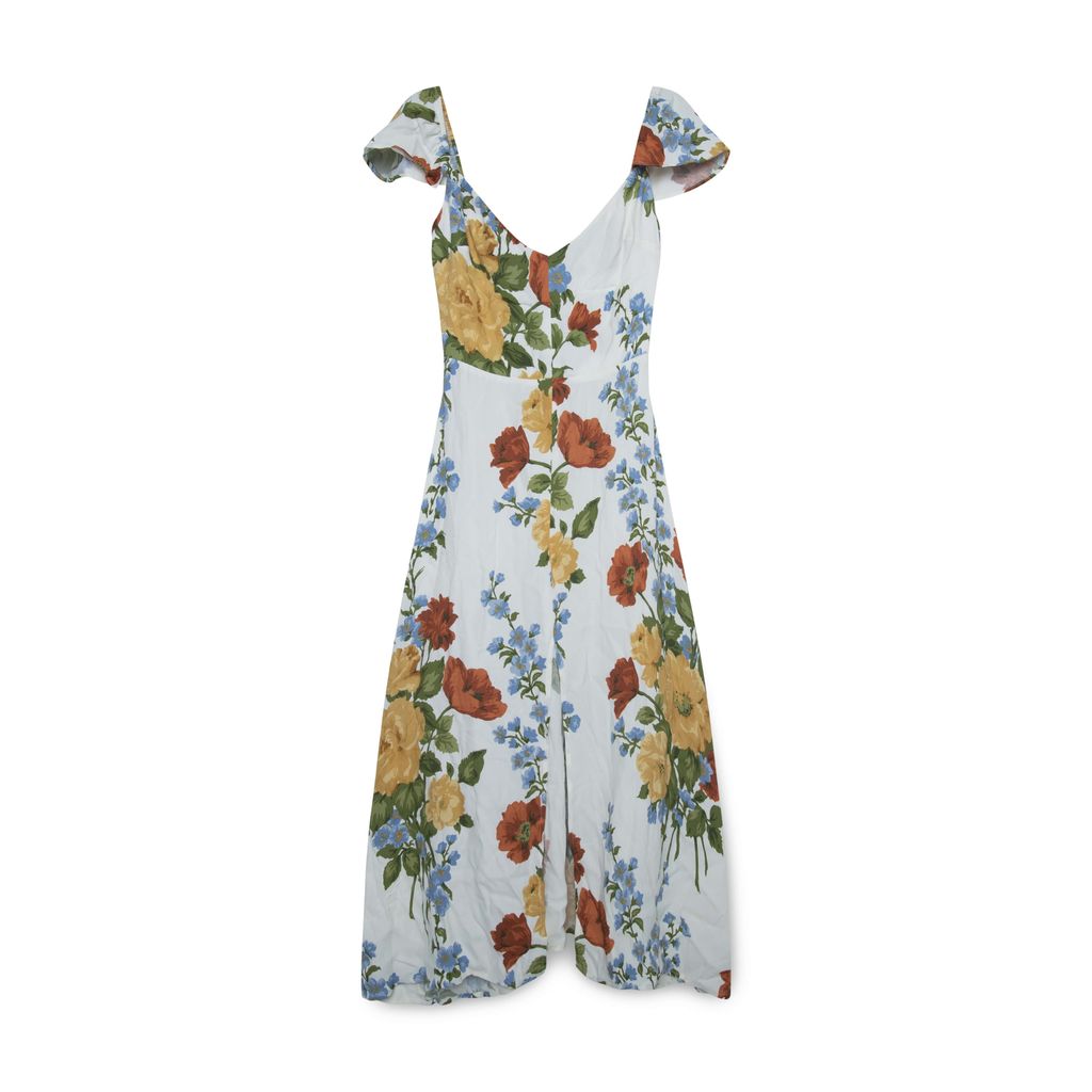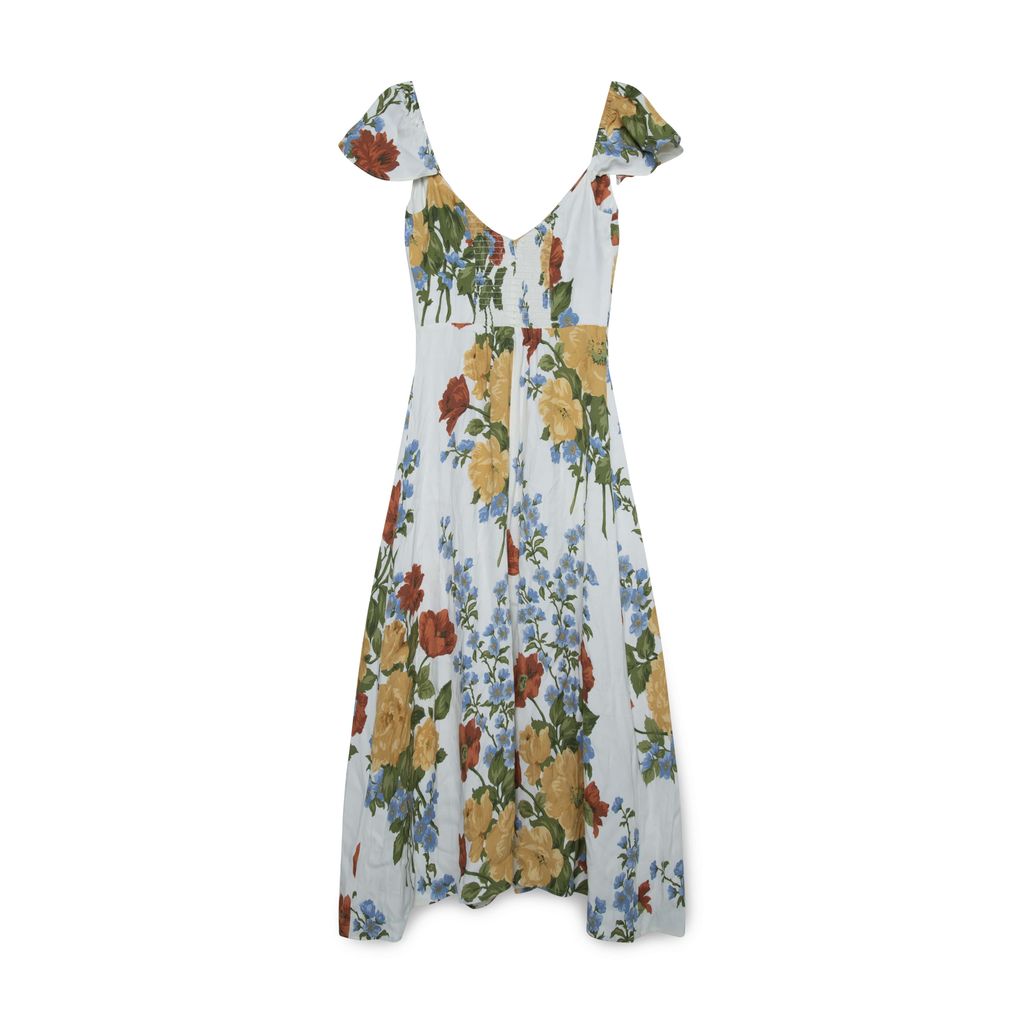 Reformation Baxley Dress features midi length dress, slight V neckline, and smocked back bodice.