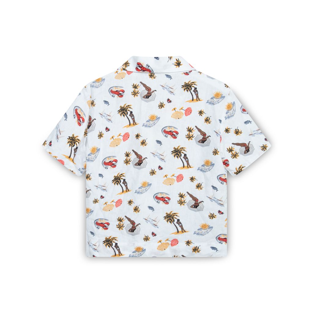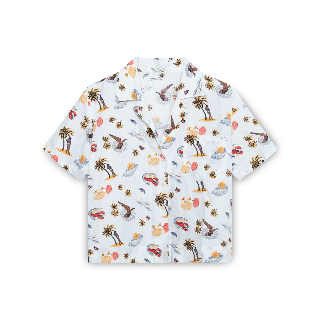 Reformation Button Up Shirt features beach themed design, front button closure, and boxy fit.