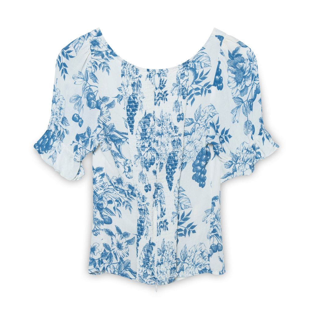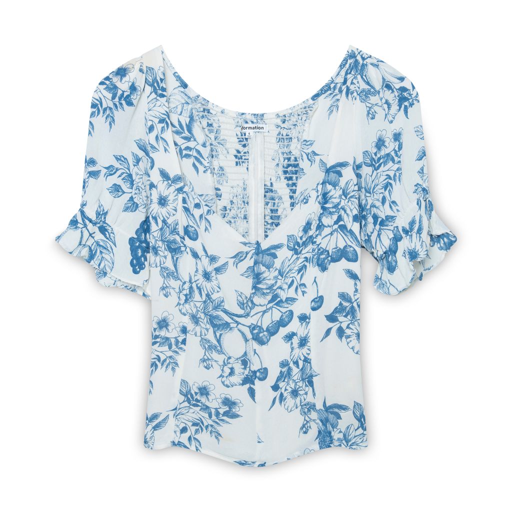 Reformation Devlan Top features smocked bodice, puffed sleeve, and sweetheart neckline.