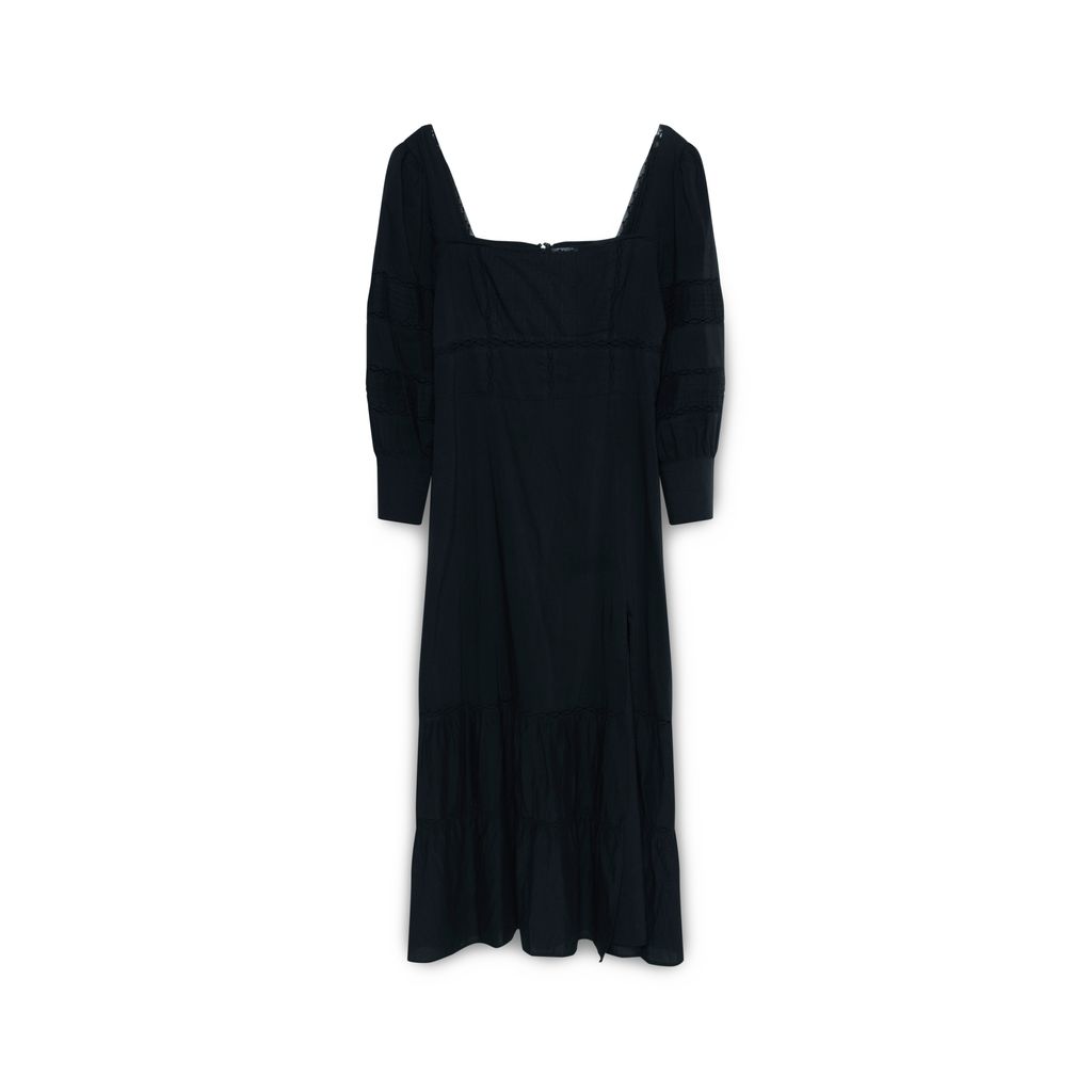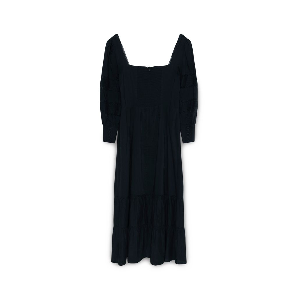 Reformation Dolan dress features puffy sleeve detail, square neckline, smoking at back, adjustable neck tie, lace detailing throughout, and zipper closure at back.