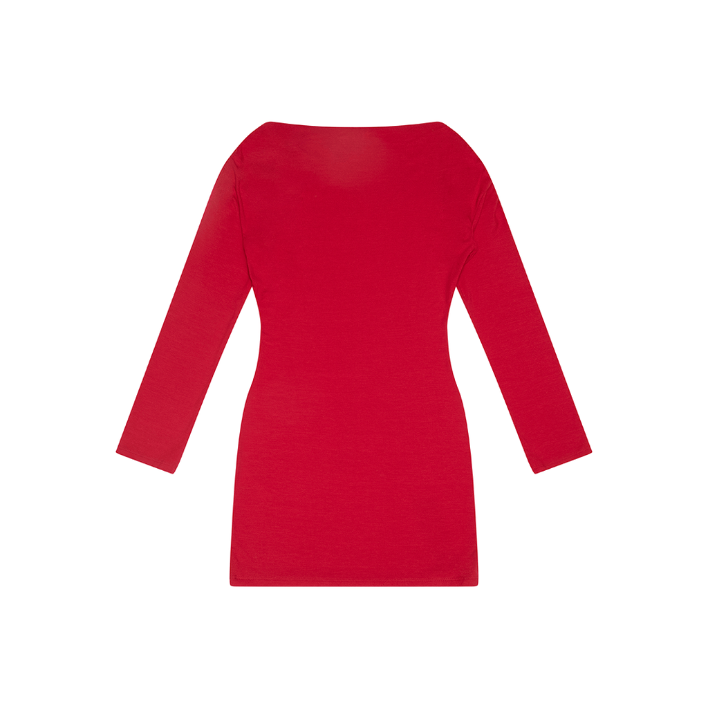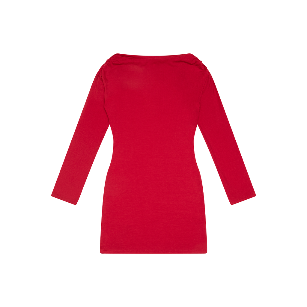 Reformation Eveline Knit Dress features boat neckline, ruched detail on shoulders and long sleeves.