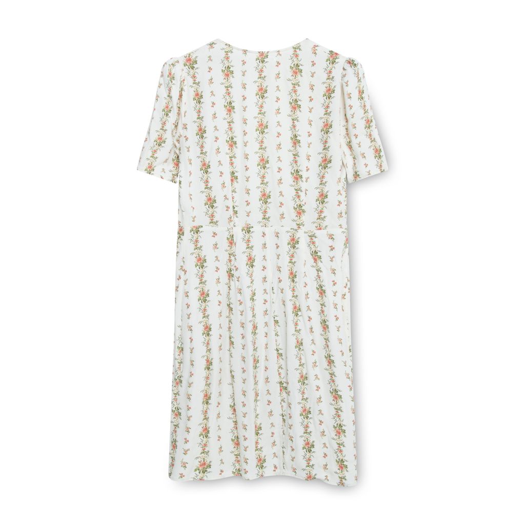 Reformation Floral Wrap Dress features quarter sleeve, front tie, V-neck, and midi length.