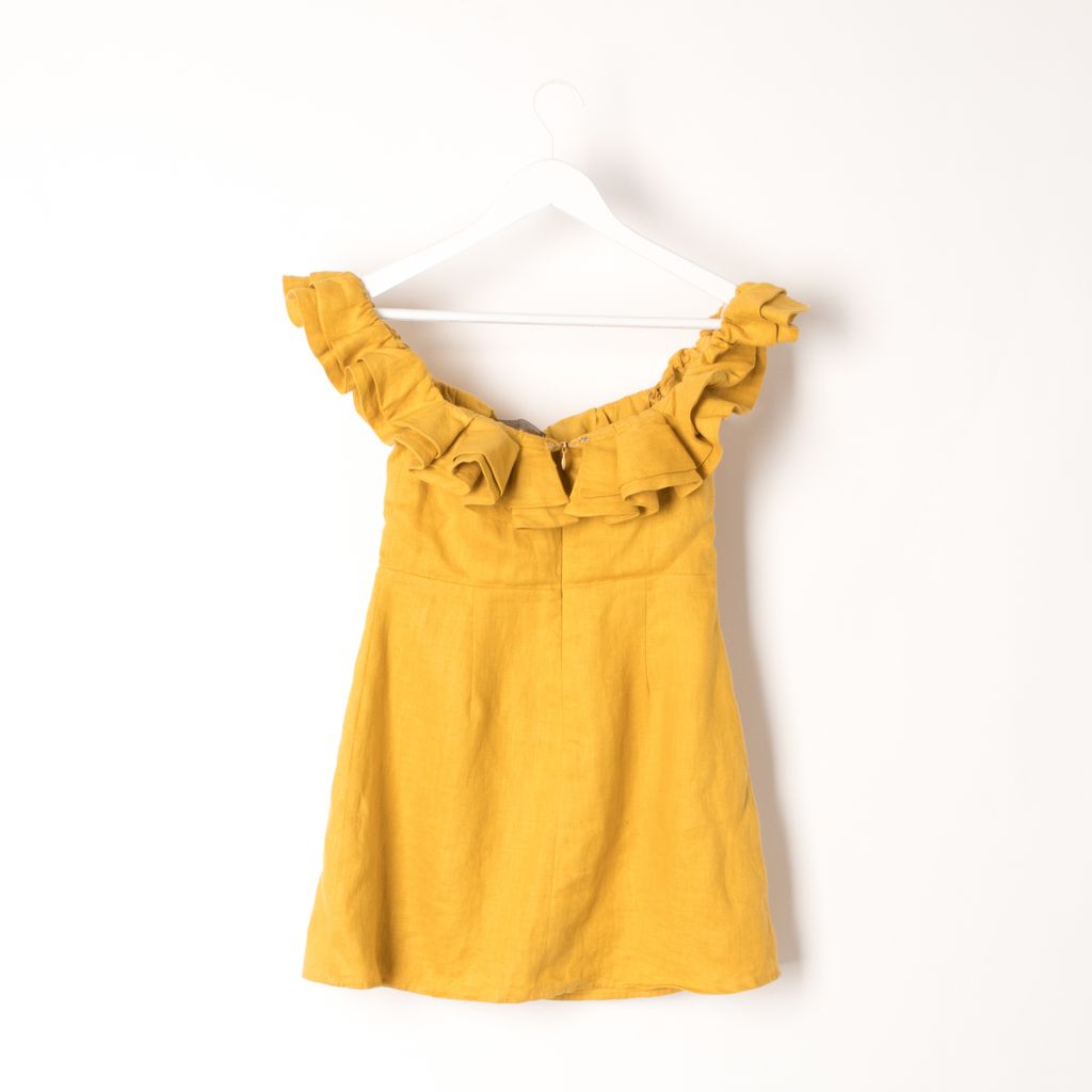 Like new, casual short dress from Reformation in mustard yellow with ruffle design on collar.