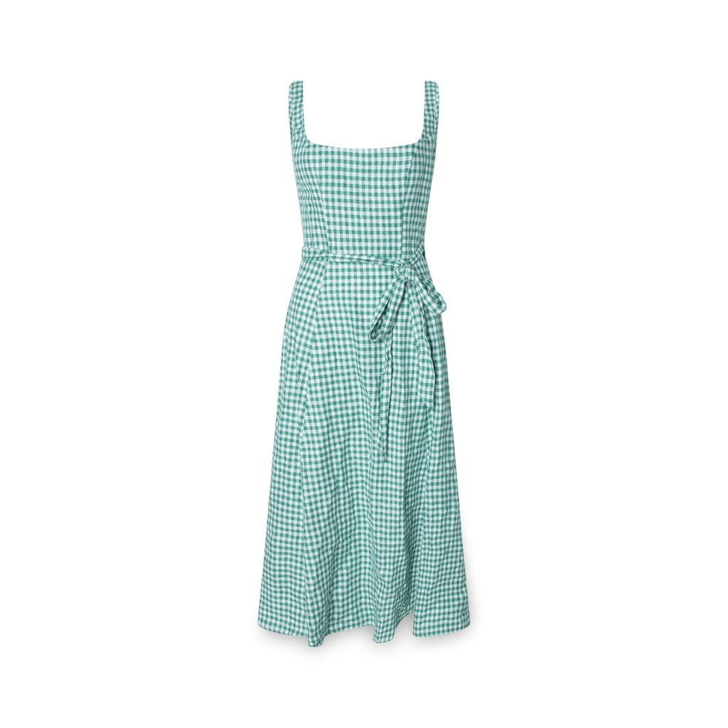 Reformation Plaid Print Midi Length Dress features plaid print, square neckline, sash-tie closure at front, and a line cut.