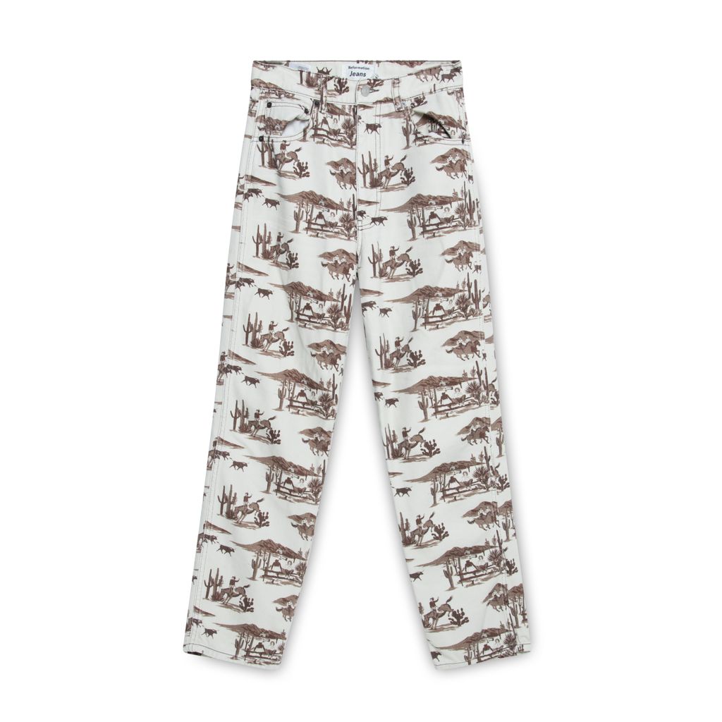 Reformation Western Jeans features all over graphic print, high waist, front button and zip fastening, 5 pocket styling, straight leg fit, and crop.