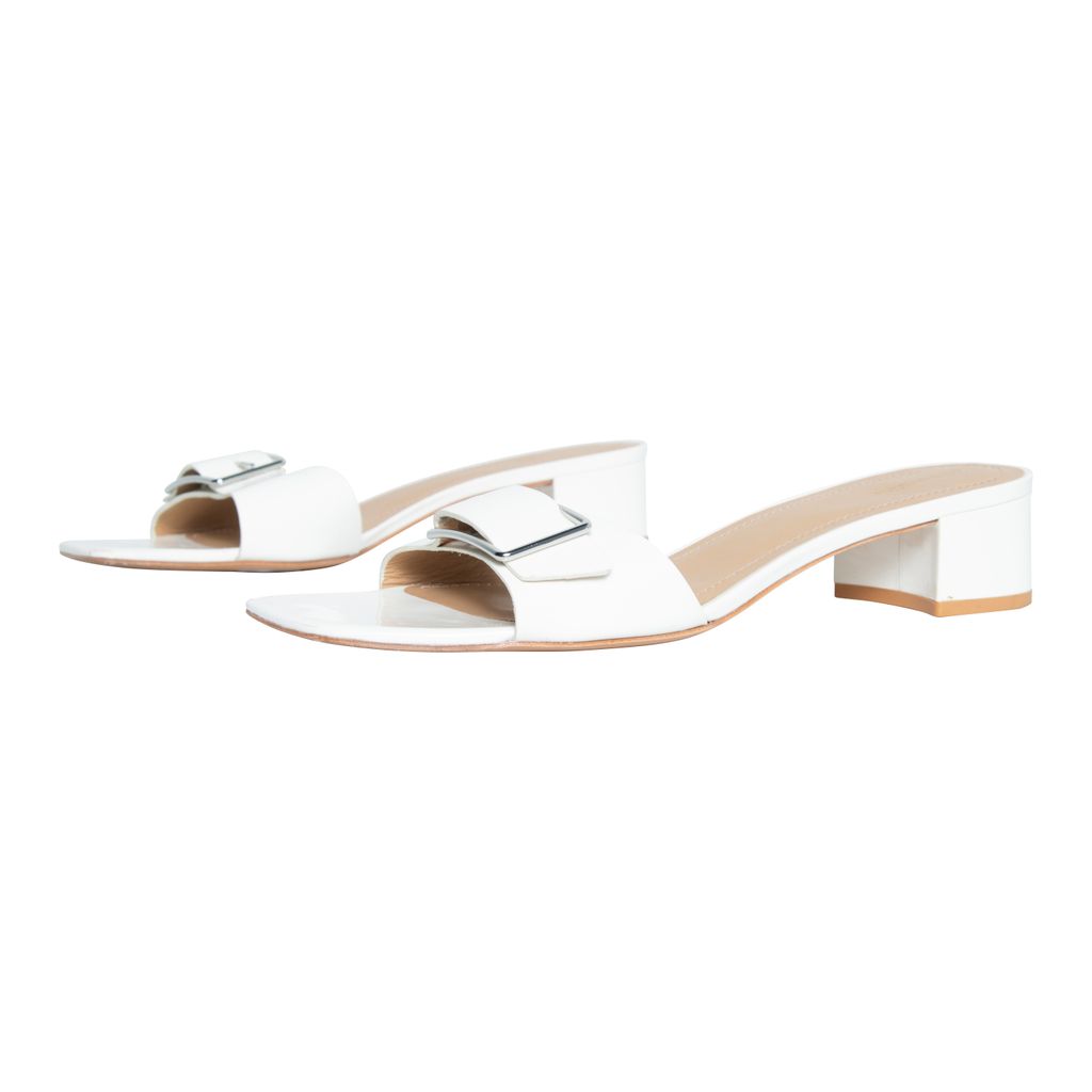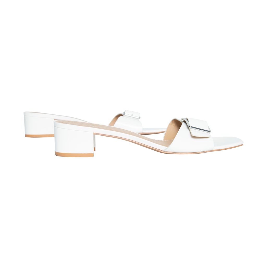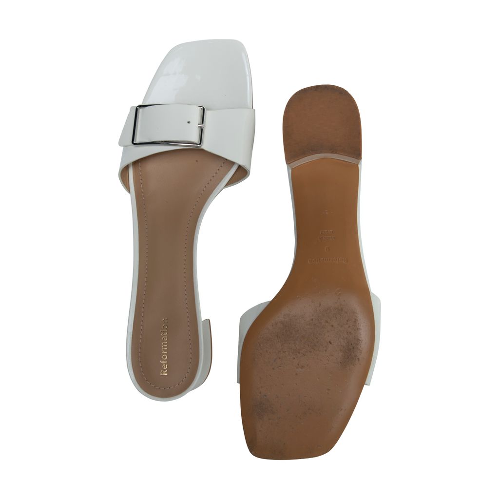 Reformation Adria Block Heeled Sandal in White Patent features low block heel and buckle detail on upper.