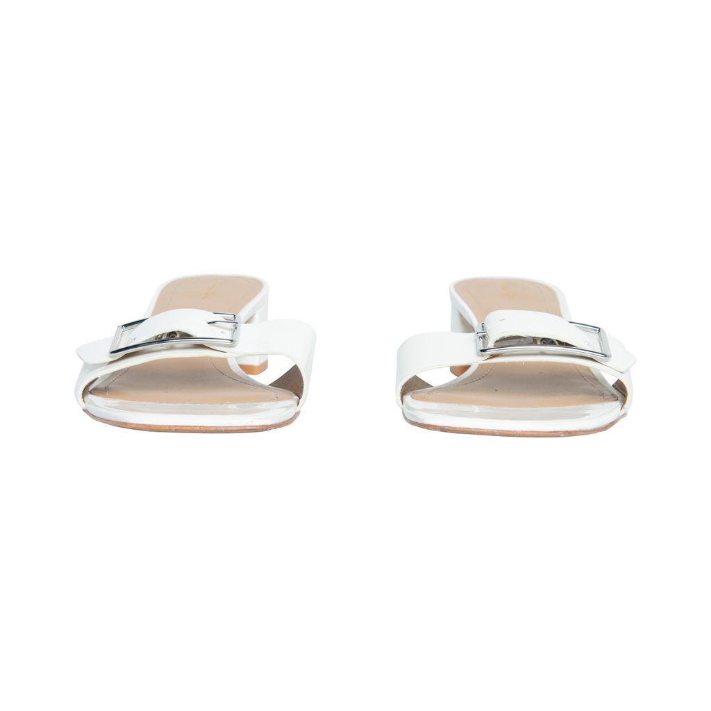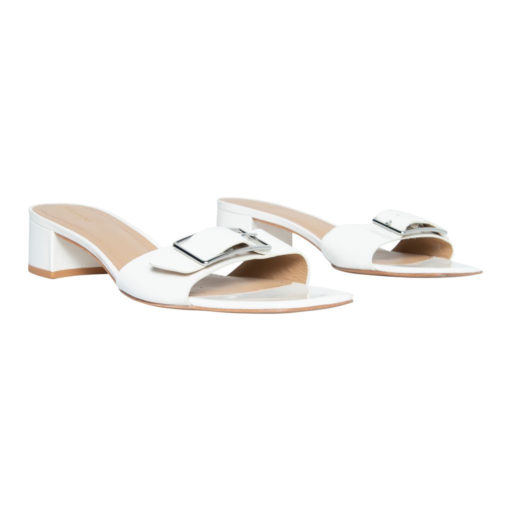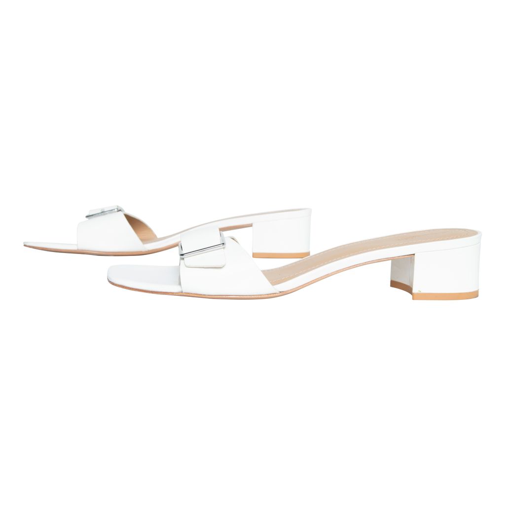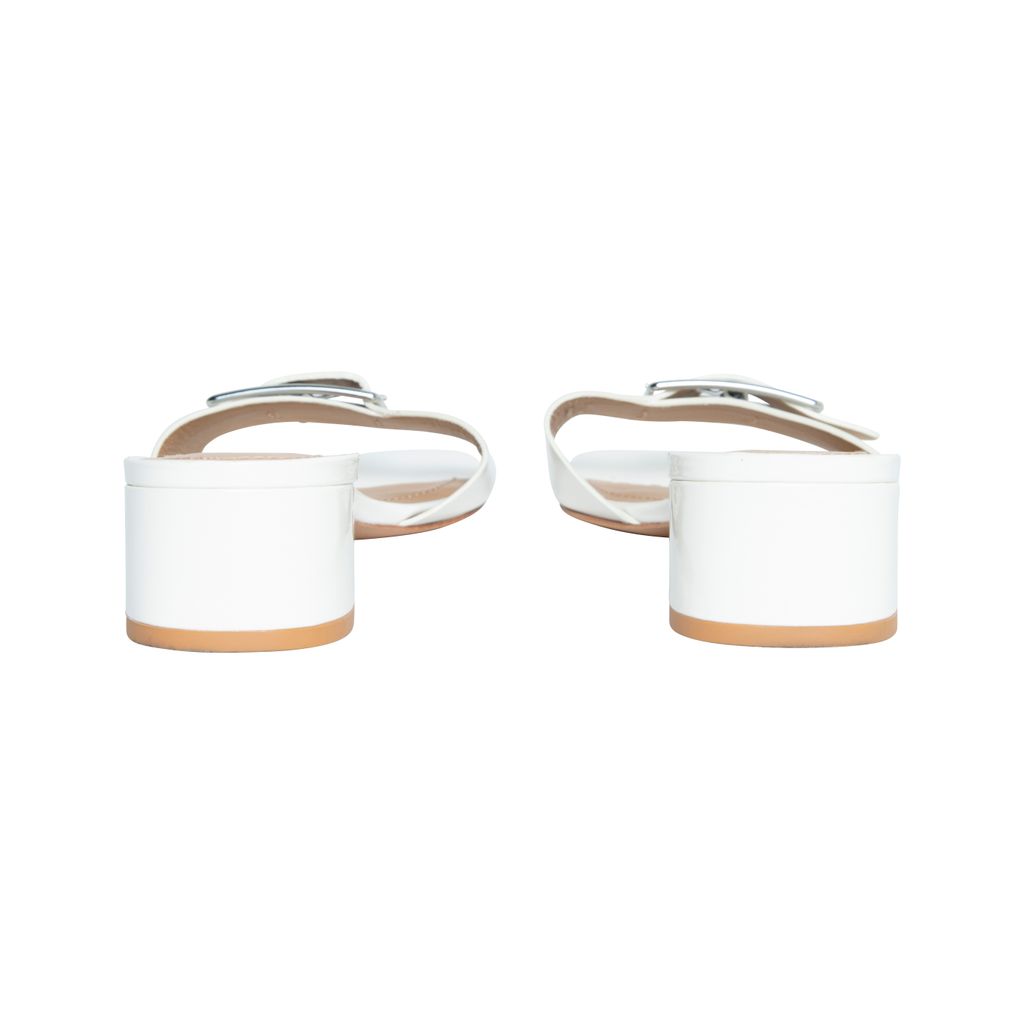 Reformation Adria Block Heeled Sandal in White Patent features low block heel and buckle detail on upper.