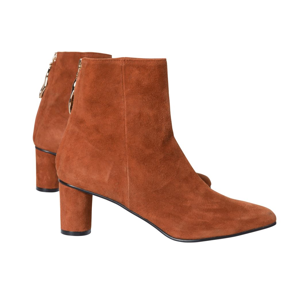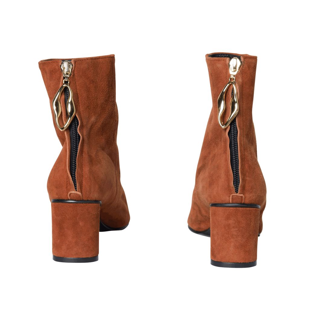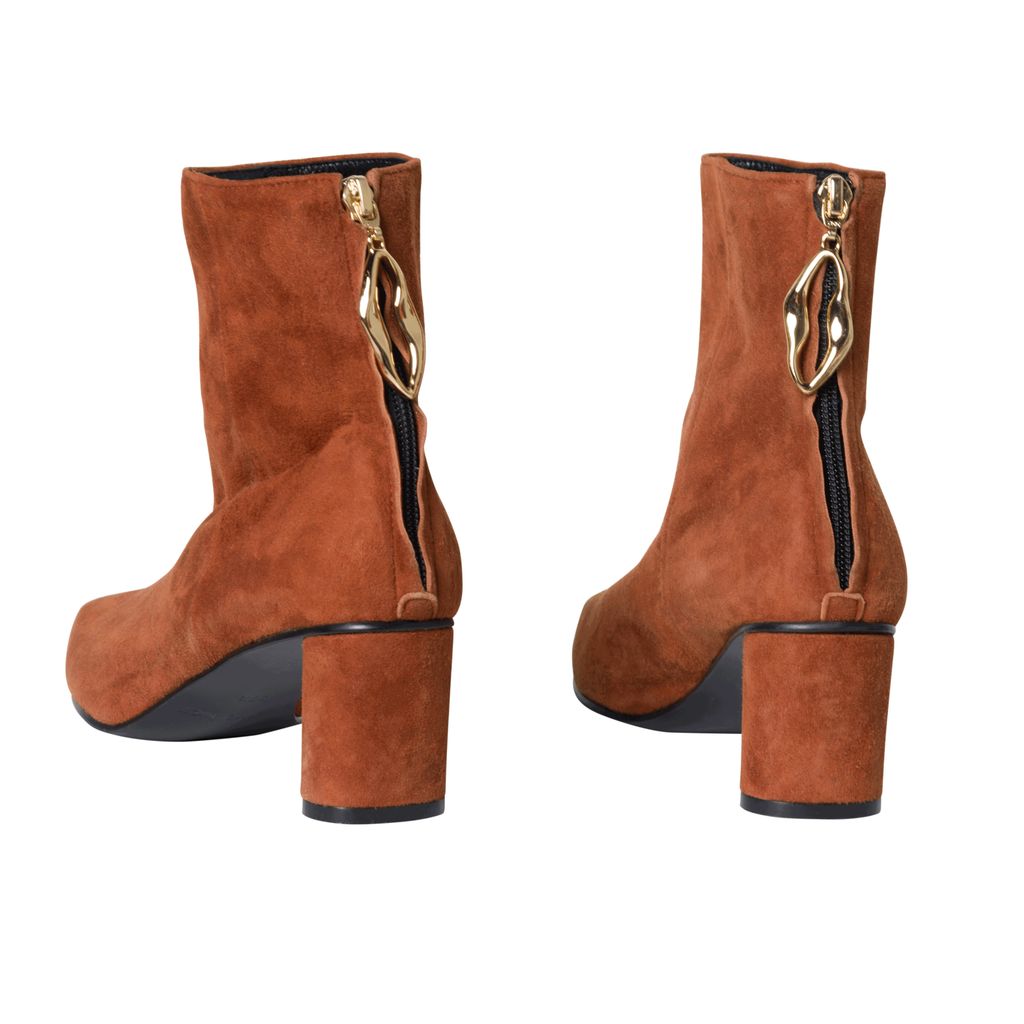 These suede ankle boots feature a rounded heel, and a gold ring zipper at the back.