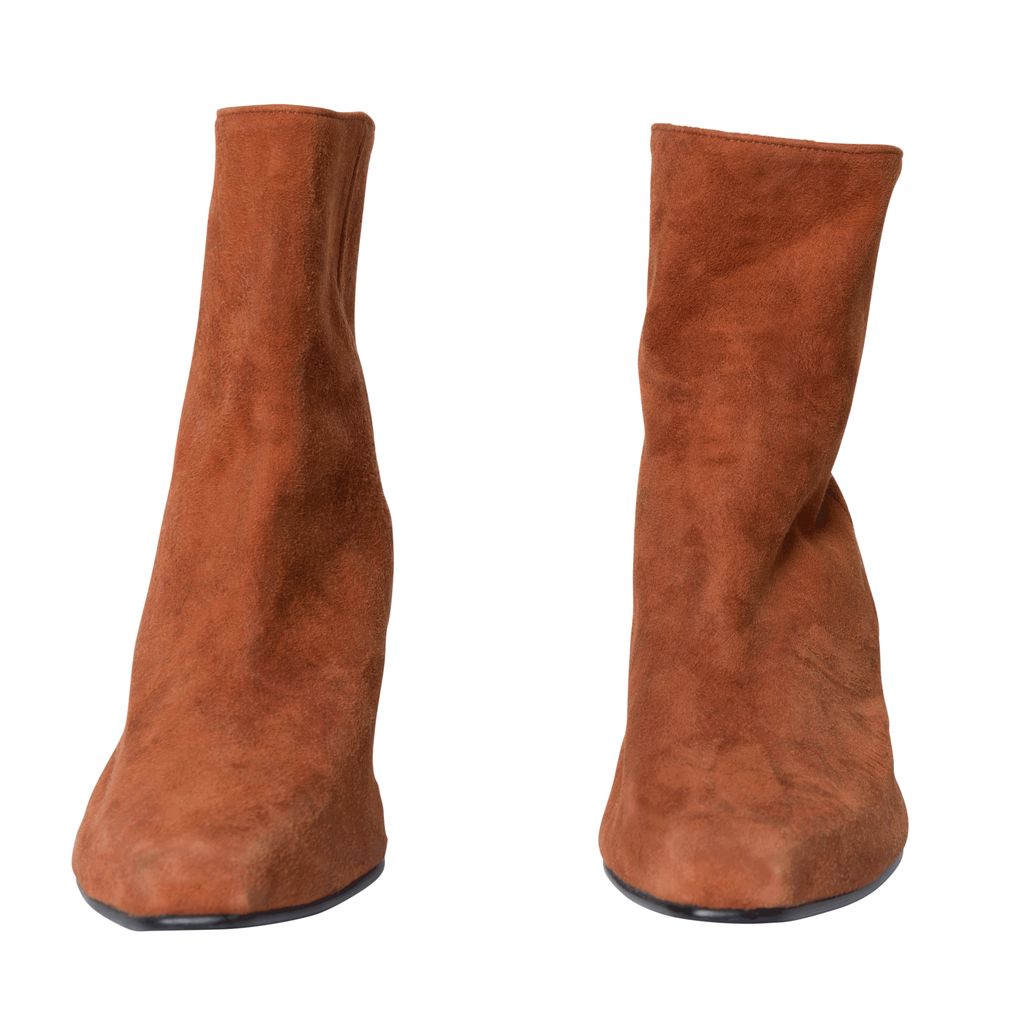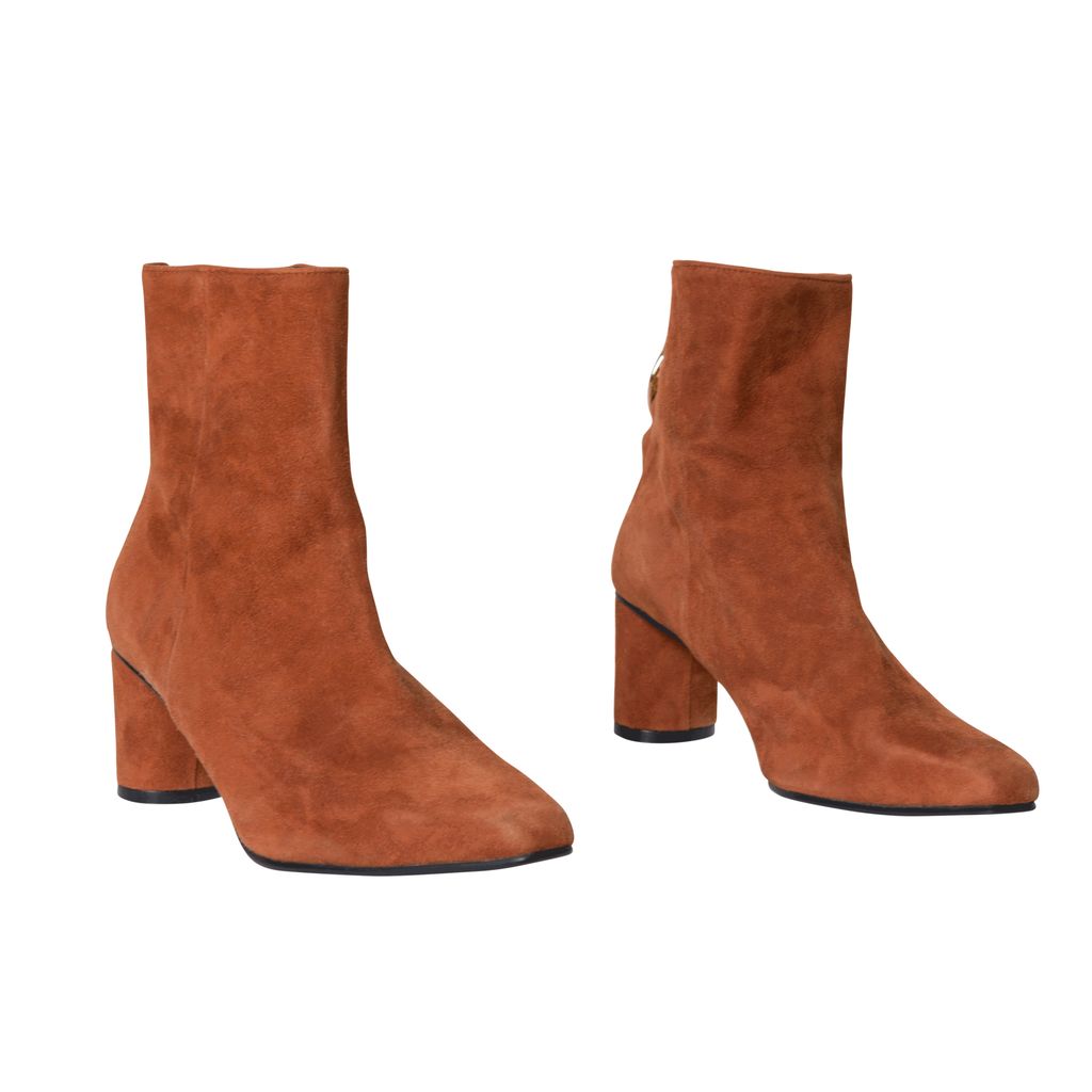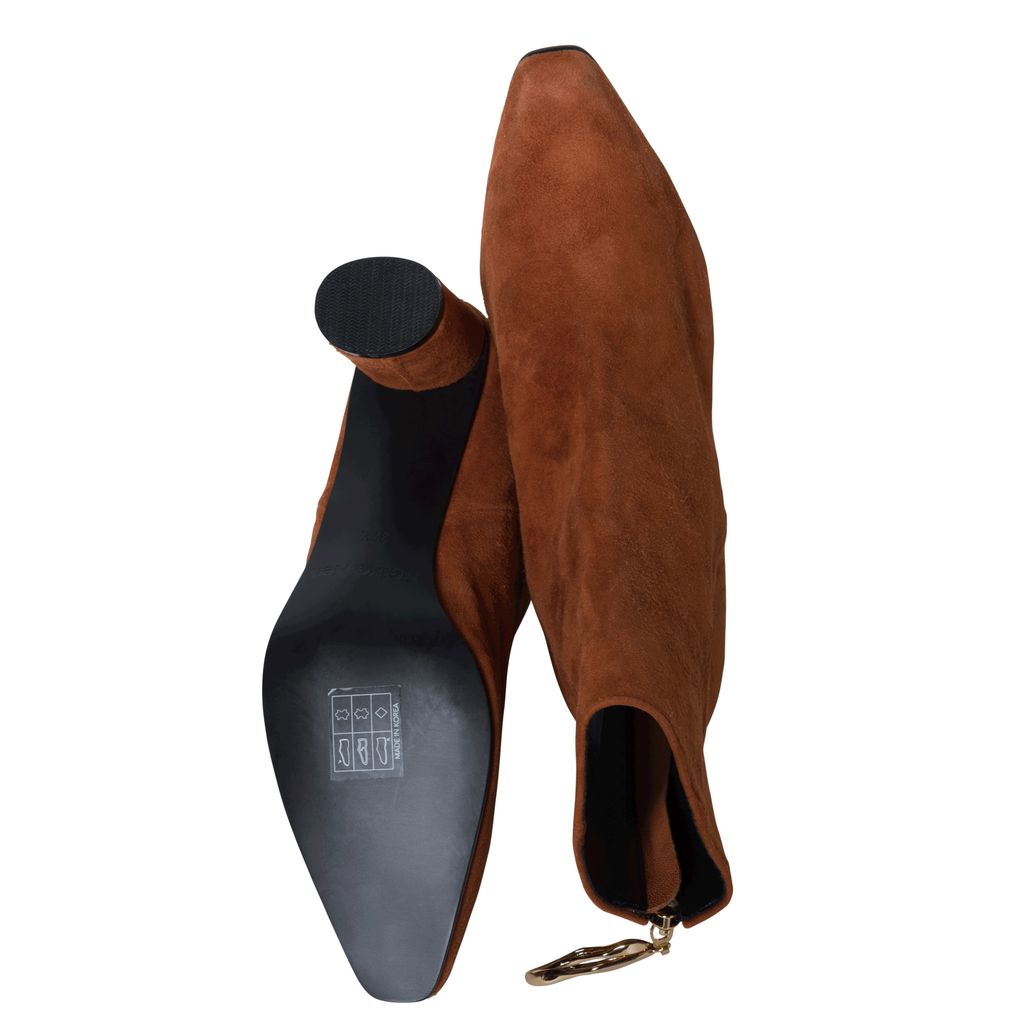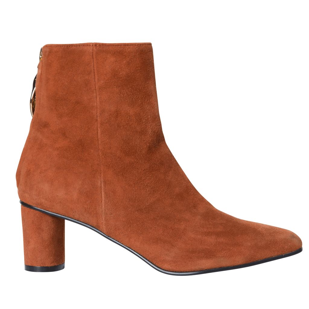 These suede ankle boots feature a rounded heel, and a gold ring zipper at the back.