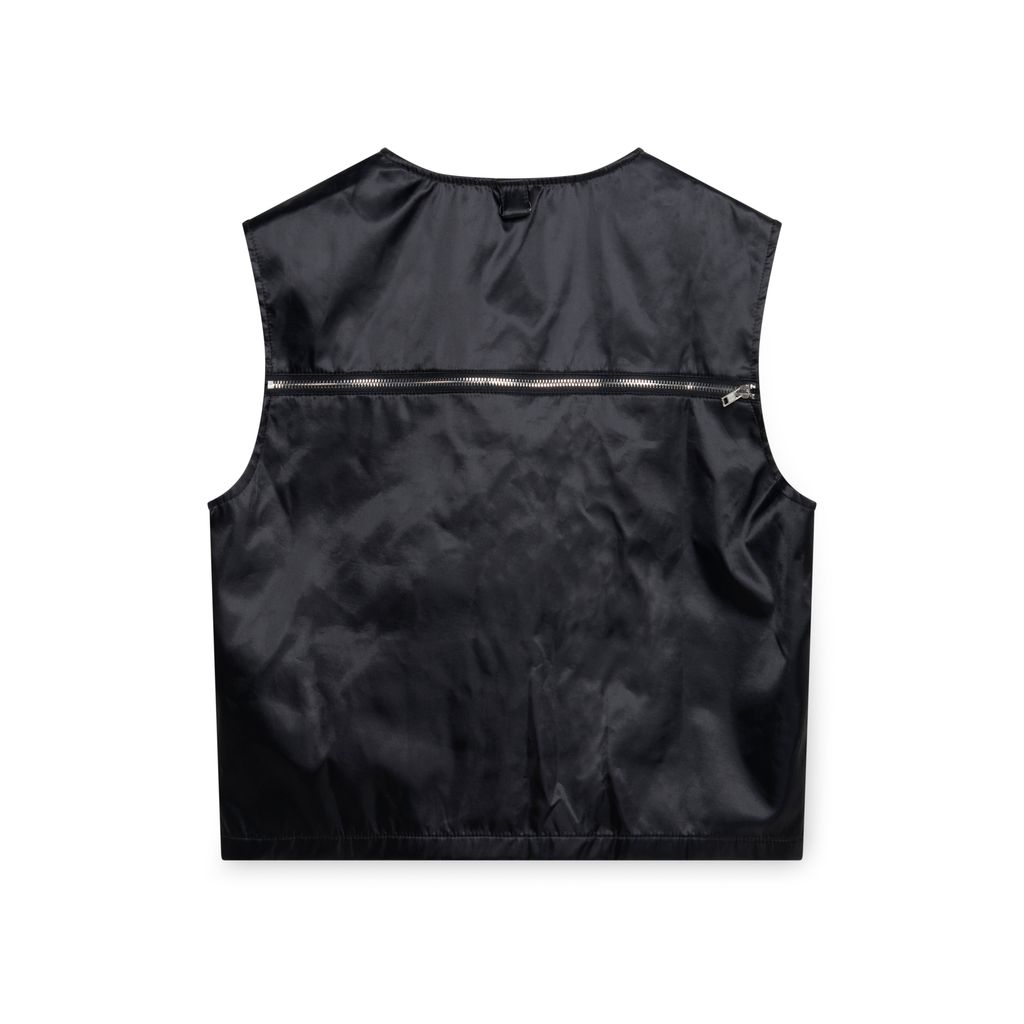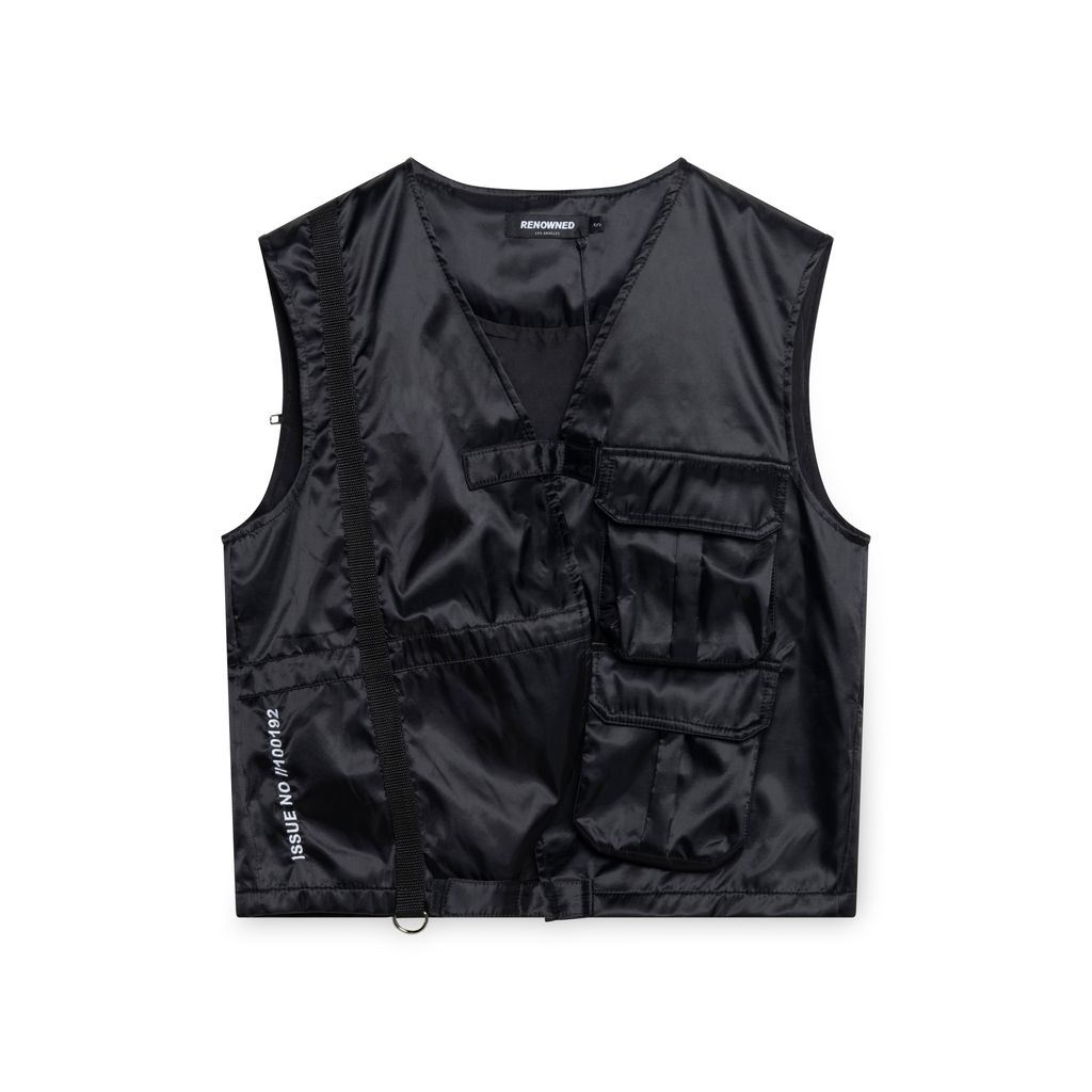 Renowned LA Black Utility Vest features 2 front utility pockets, velcro front closure, and silver zipper on back.