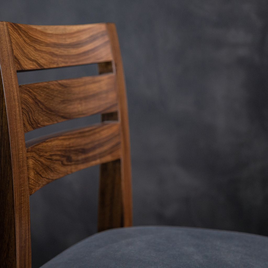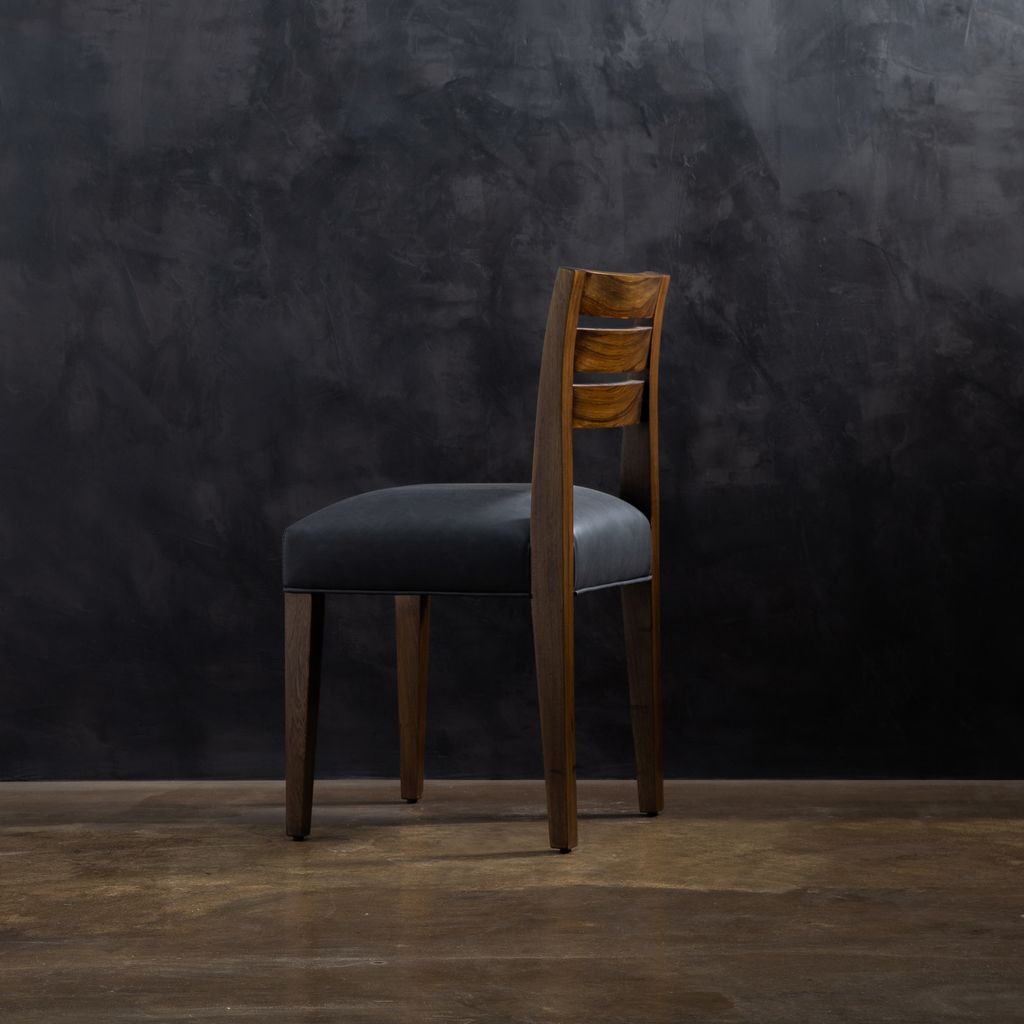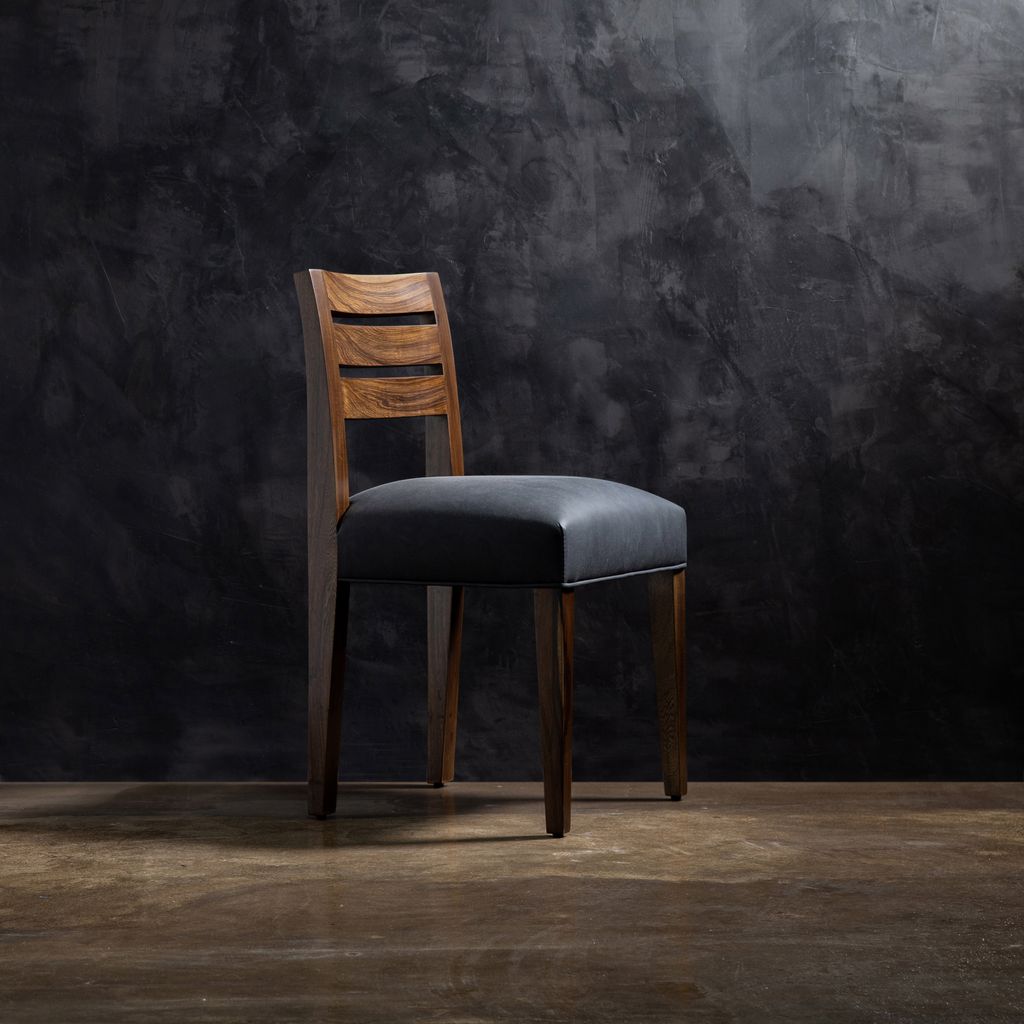 The Renzo chair features a solid wood frame with a slatted back and a gently curving back leg. Like all the pieces in the Costantini collection, this is handmade in our family-owned workshop in Buenos Aires since 2002, and can be made as a stool, bench, or booth. Usually in stock as shown and available for quick ship. Shown in Argentine rosewood finish.