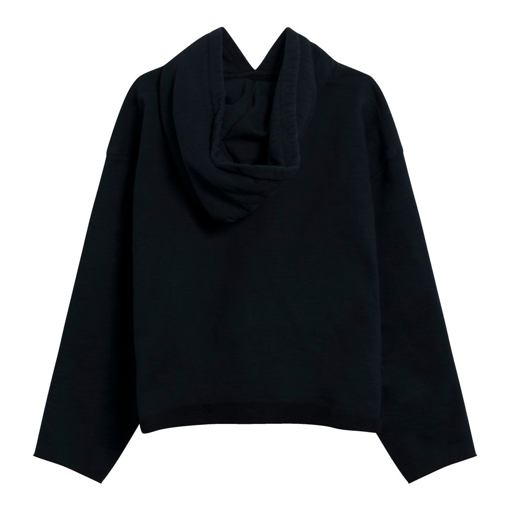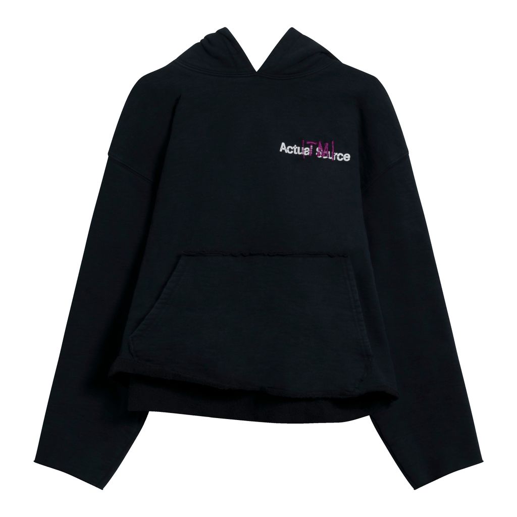 A reworked piece by Caleb Flowers- crafted from heavy 12.5 oz brushed and compacted cotton fleece, this hooded sweatshirt from Actual Source is designed to last many washes and wears. Updated with multi-colored tight blanket stitched embroidery over the original printed chest logo and raw cut trim on pouch pocket, sleeves and hem. Pre-owned.