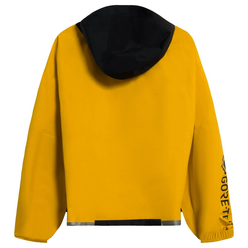 A reworked piece by Caleb Flowers- Lightweight, waterproof, and wind-resistant. This Nike ACG jacket is crafted from a woven fabric with a water-resistant GORE-TEX finish and features a 3-piece hood with adjustable coverage, 1/2 zip design, two side pockets, zipper pocket at center-front and elastic at wrists. Updated with embroidered Nike ACG logo at right chest and raw cut, rolled hem with topstitch detail. New with tags.