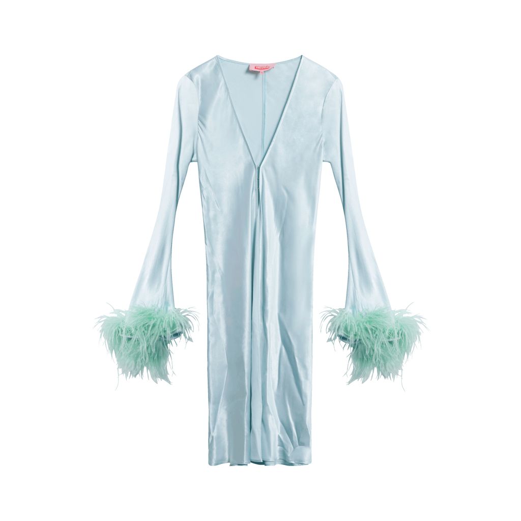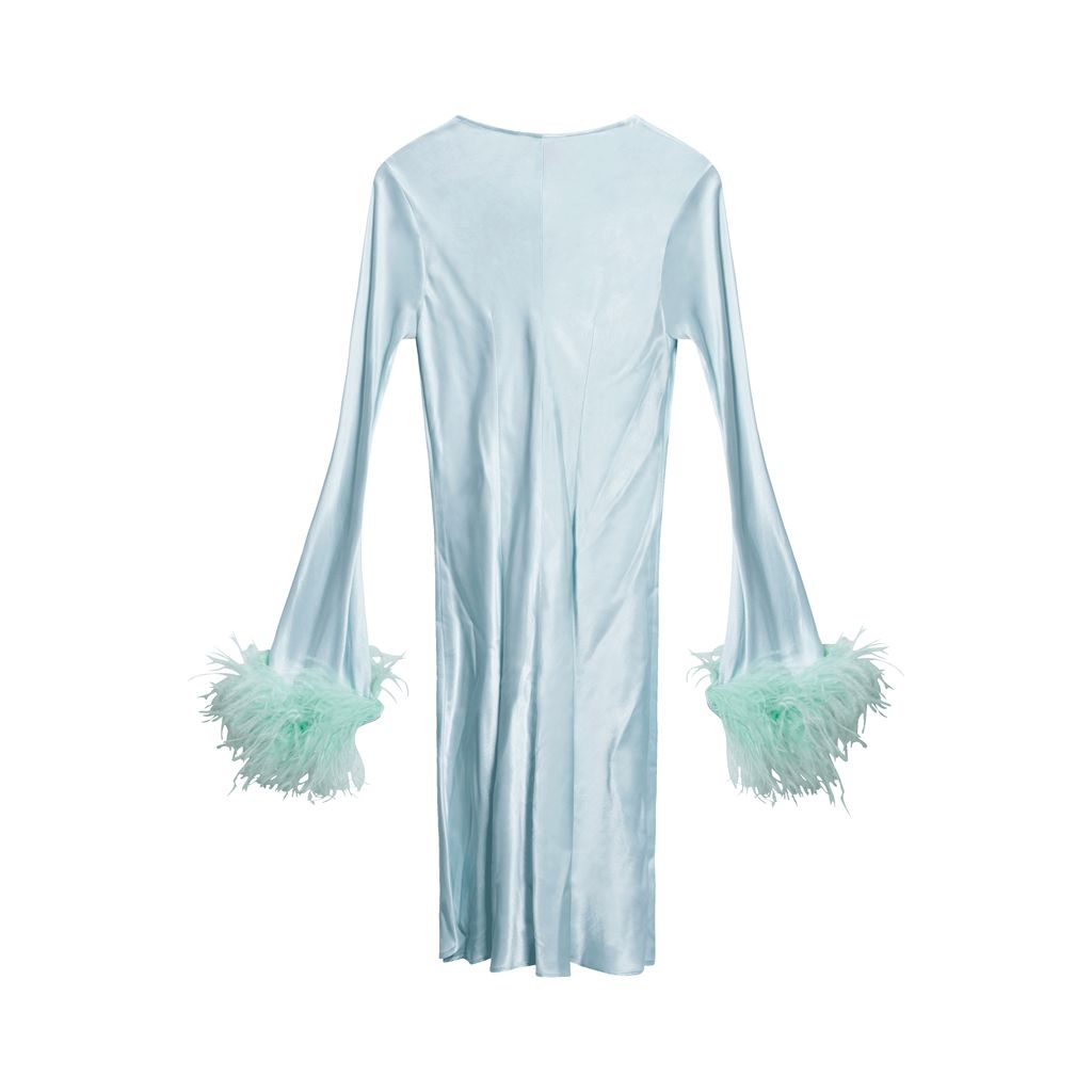 Features ostrich feather puff sleeves and 3 point chest closure
