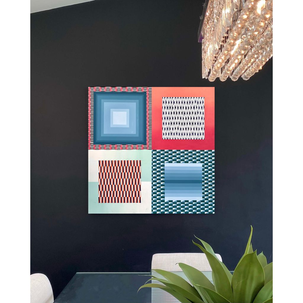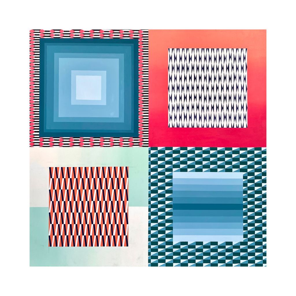 Sophia Croasdale is a large-scale abstract artist based in Austin, TX who earned her BFA from Cal Poly, San Luis Obispo. Her work is rooted in pattern painting, exploring the interplay of light, illusion, and color theory to create rhythmic compositions. Deeply influenced by architecture, Sophia draws inspiration from the structured repetition found in building materials, tiles, and windows, as well as the organic patterns of nature— such as seashells and water reflections. She considers both the visual rhythm and emotional resonance of color and form, using vibrant hues, gradients, and dynamic patterns to create a balance between harmony and chaos. Her current body of work centers on echoes—forms that resemble ripples or sound waves, each shape reverberating from the one before it. The gradient transitions within these forms enhance the sense of movement, evoking the lingering presence of sound or memory.