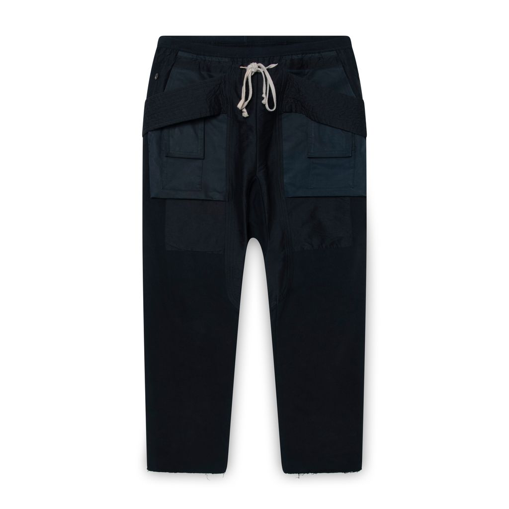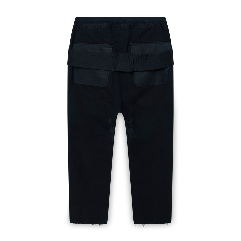 Rick Owens Black Drawstring Long Trousers features drawstring at elasticized waistband, raw hem, and 4 pocket styling.