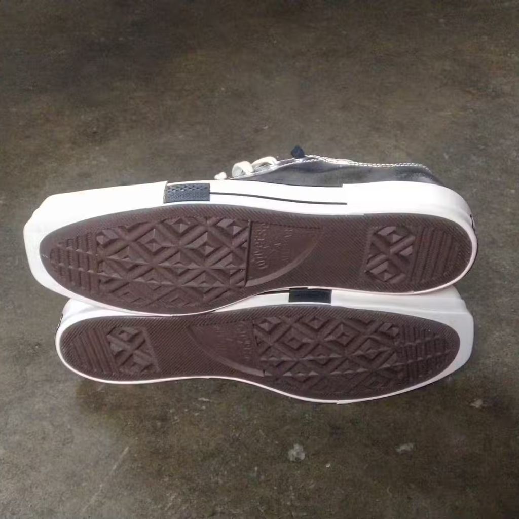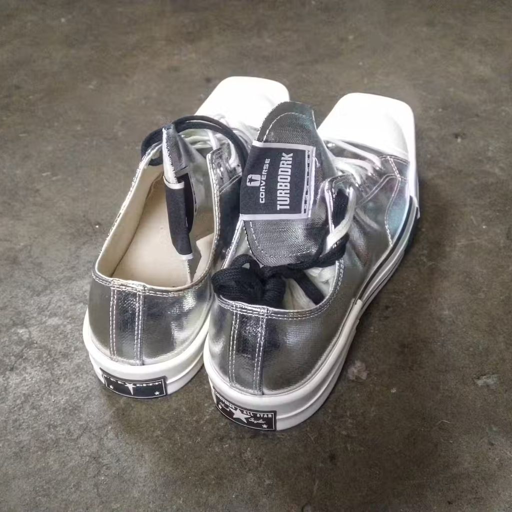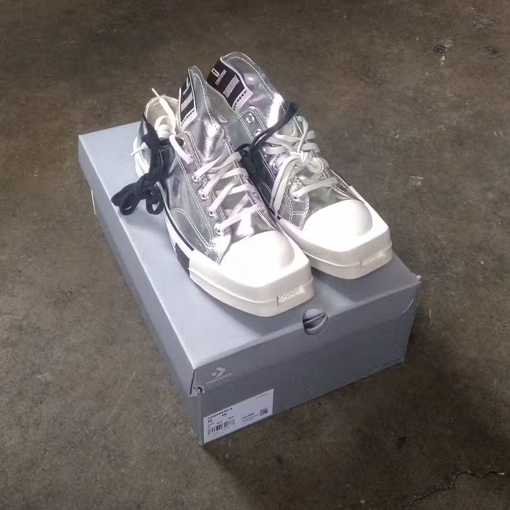 Rick Owens DRKSHDW x Converse 70 DRKSTR A01292c features square toe, silver metallic finish, white and black laces, and logos on tongue.