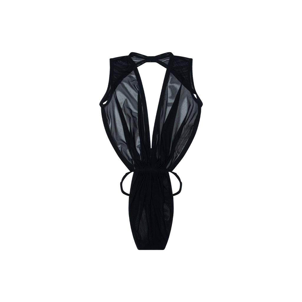 Rick Owens FW2021 Black Gia String Bodysuit features V-neckline, semi-sheer material, open back, stretch mesh material, and knife pleating at waist.