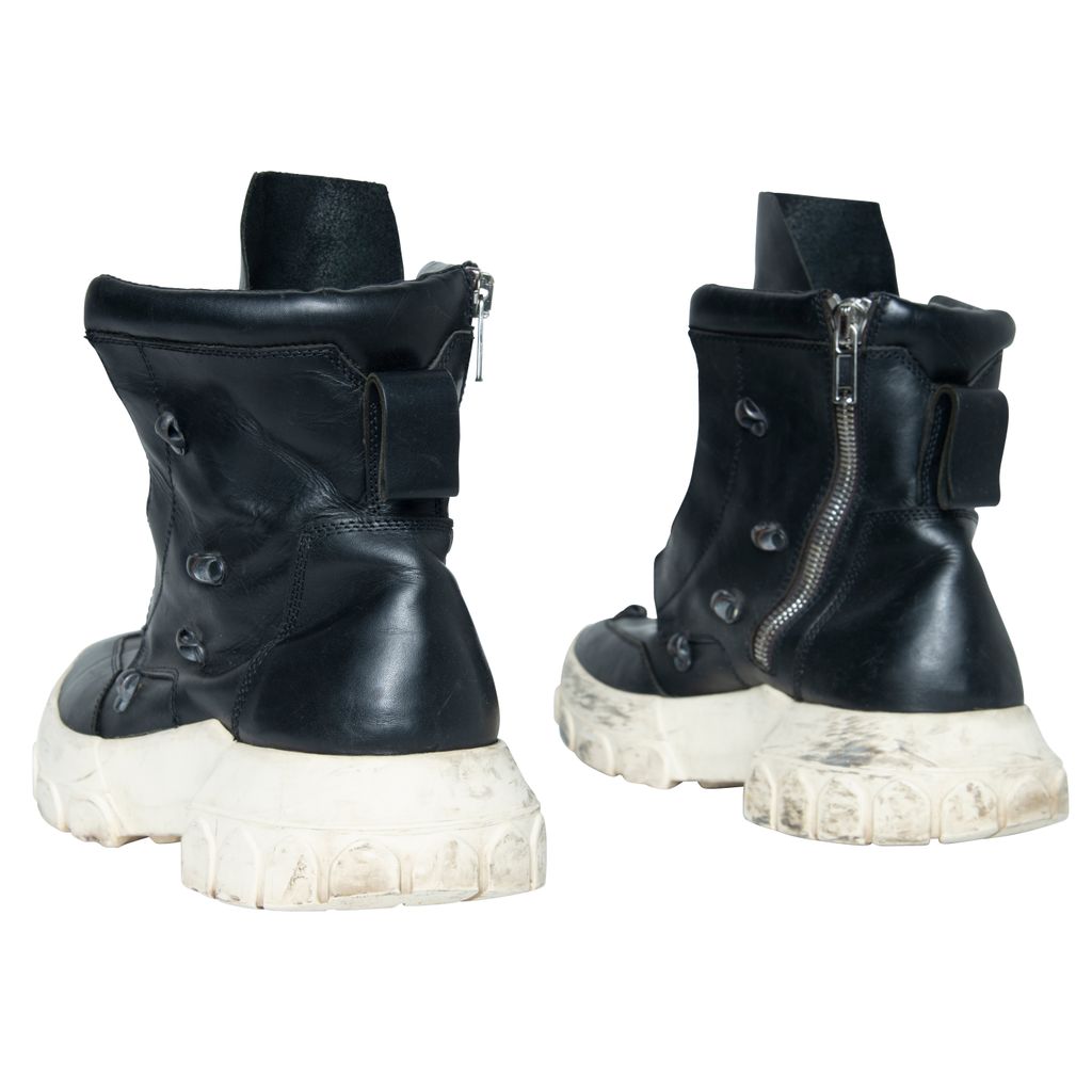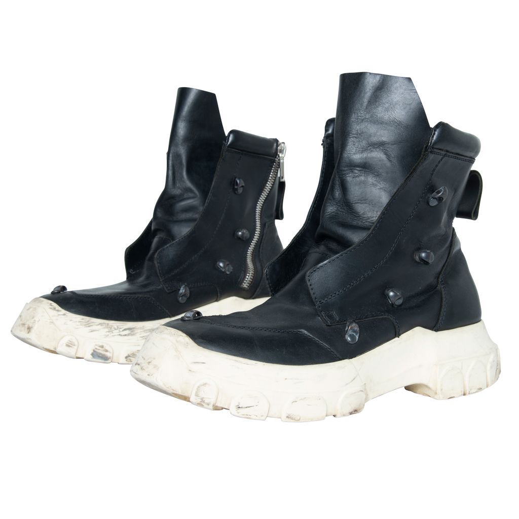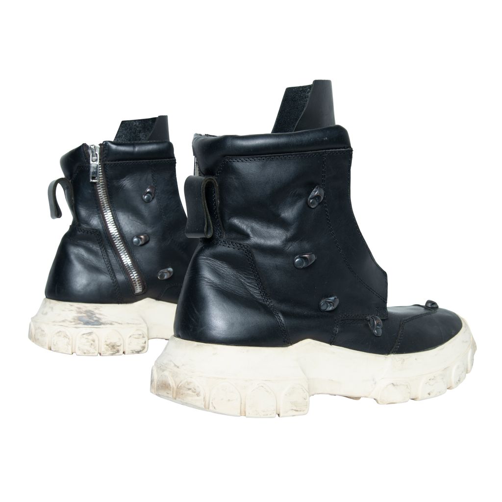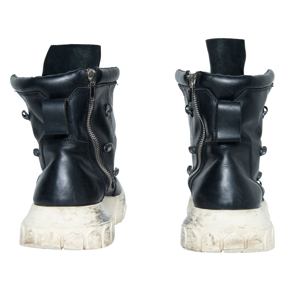 Rick Owens Tractor Hexagram Hiking Boots feature side zip closure, leather shell, rubber sole and minor scuffs on the sole.