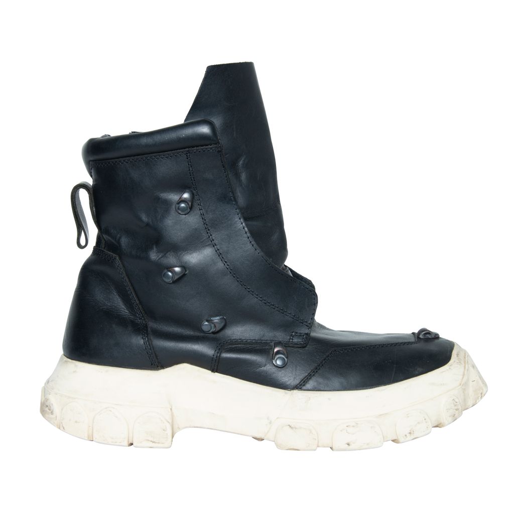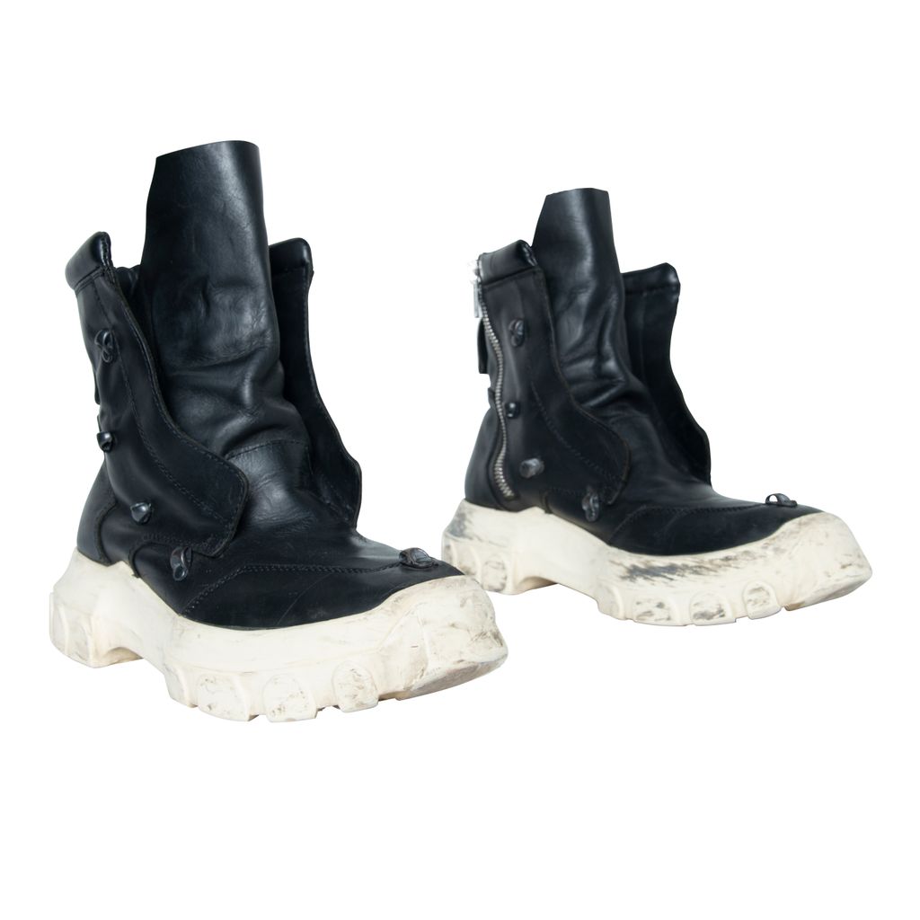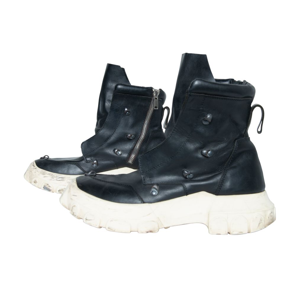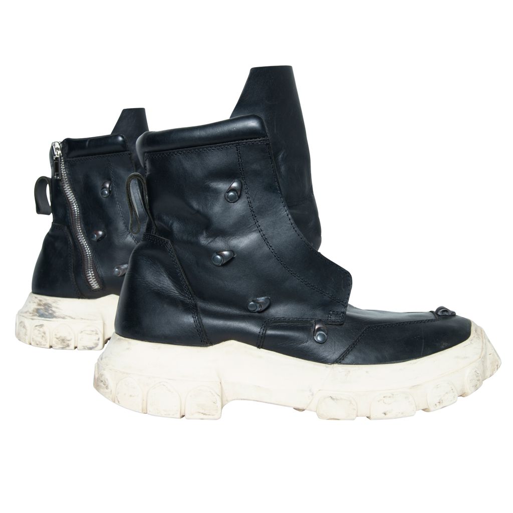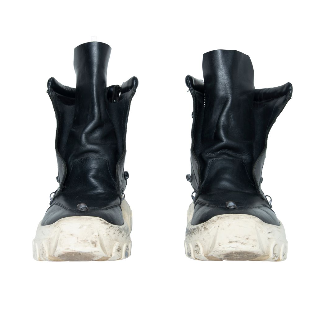 Rick Owens Tractor Hexagram Hiking Boots feature side zip closure, leather shell, rubber sole and minor scuffs on the sole.