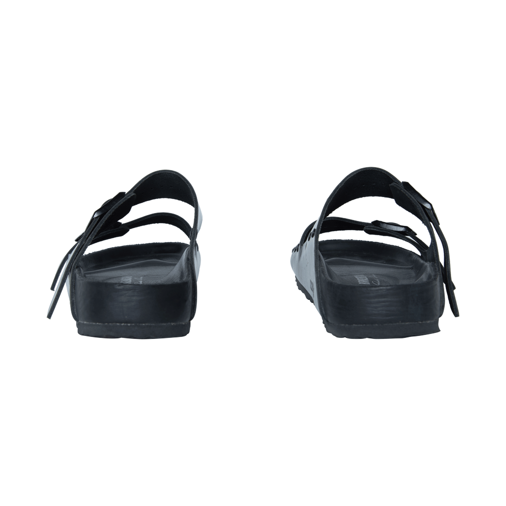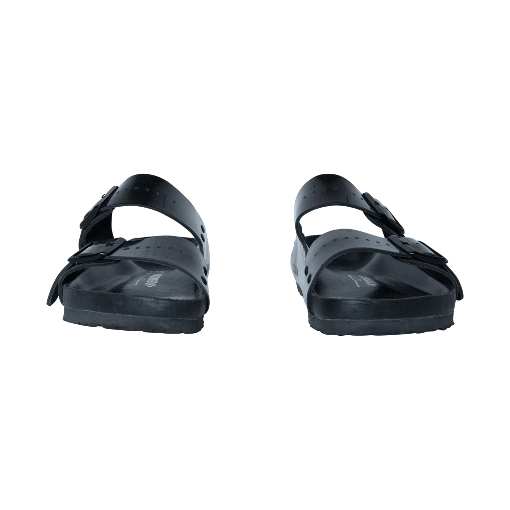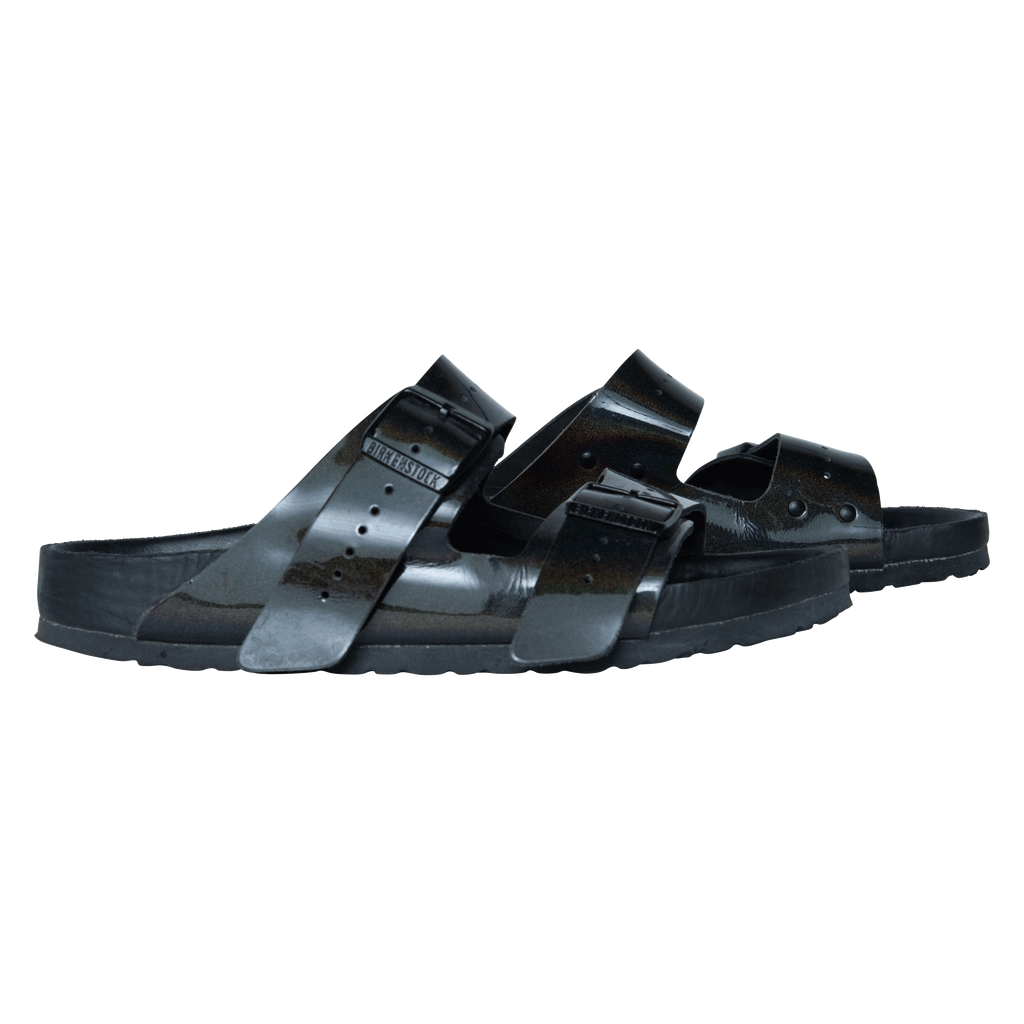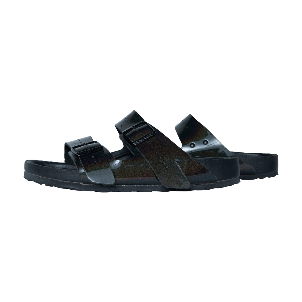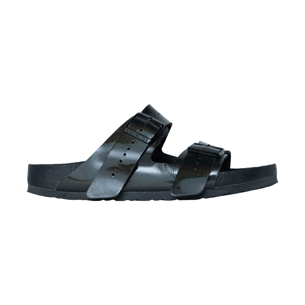 Rick Owens xBirkenstock Arizona Buckled Sandals features patent leather exterior, calf leather lining, and rubber sole.