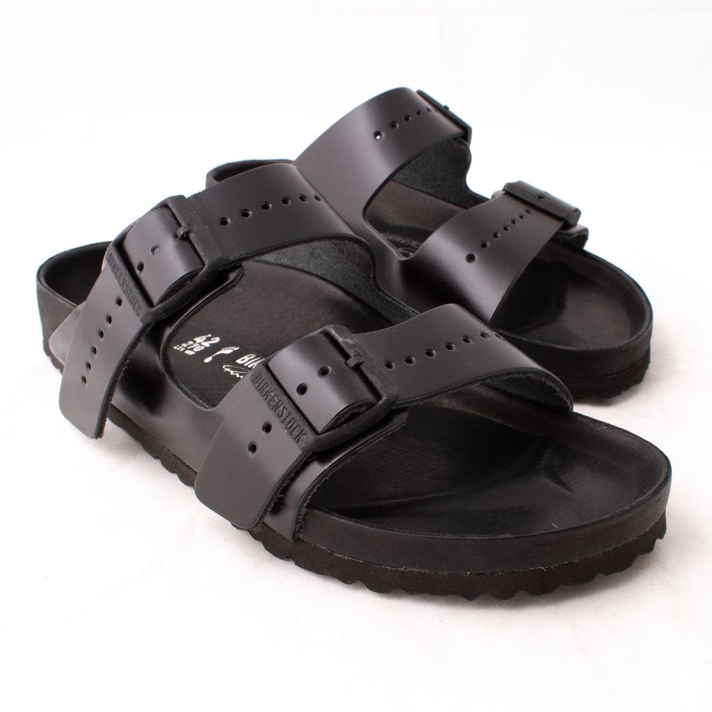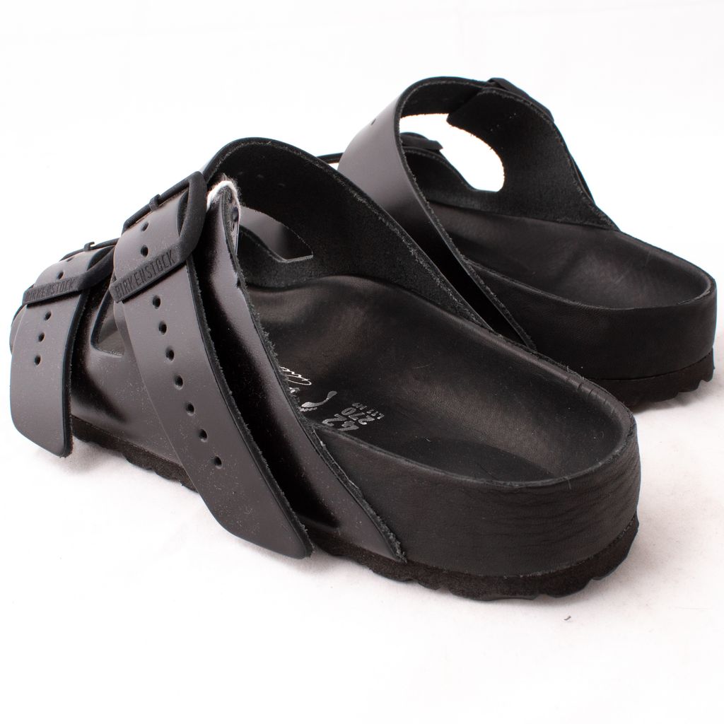 Brand new in box. Rick Owens' partnership with Birkenstock is proof that some of the most unexpected collaborations produce the best result. Based on the latter brand's 'Arizona' double-strap sandals, this pair is made from smooth black leather and set on the label's signature contoured footbeds. The perforated straps mean the buckle can be adjusted for the perfect fit.