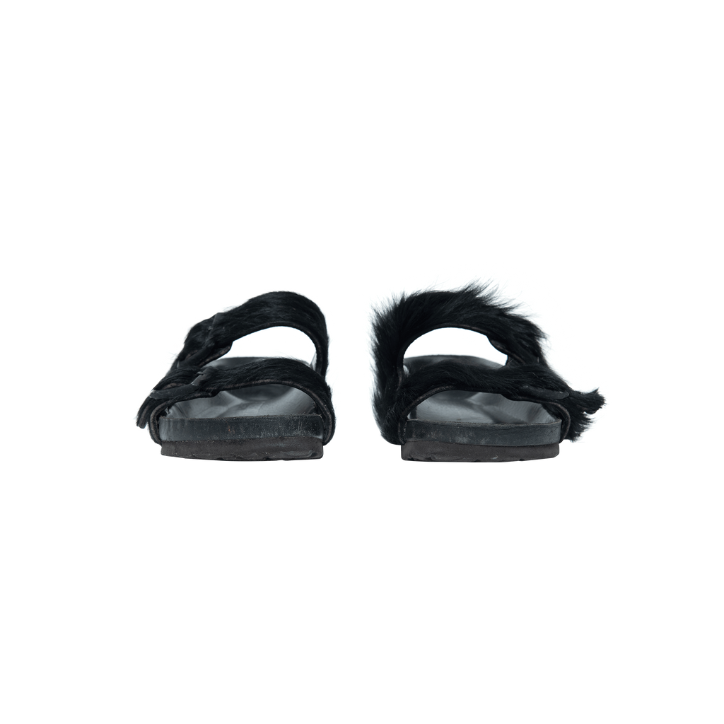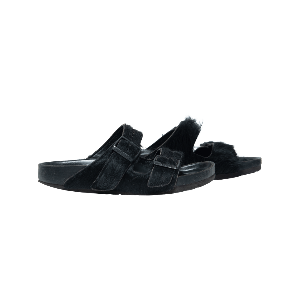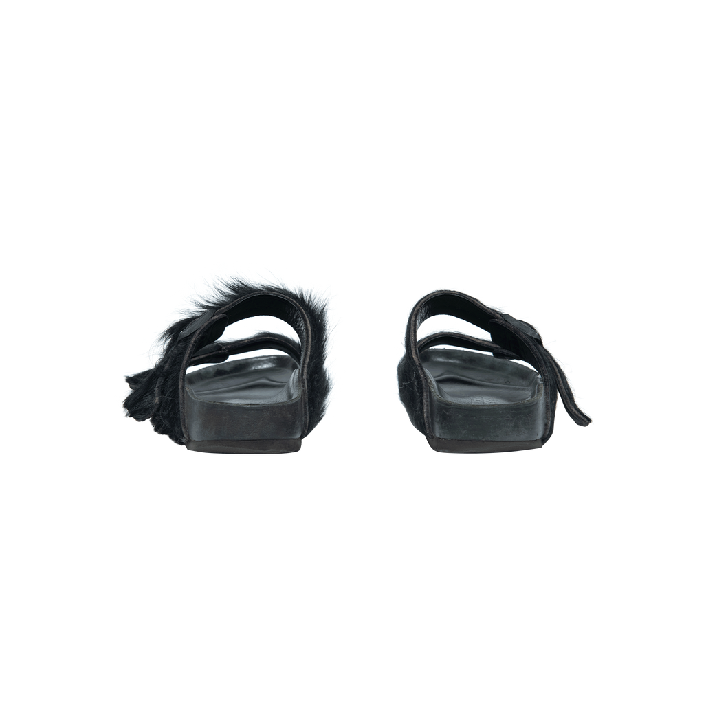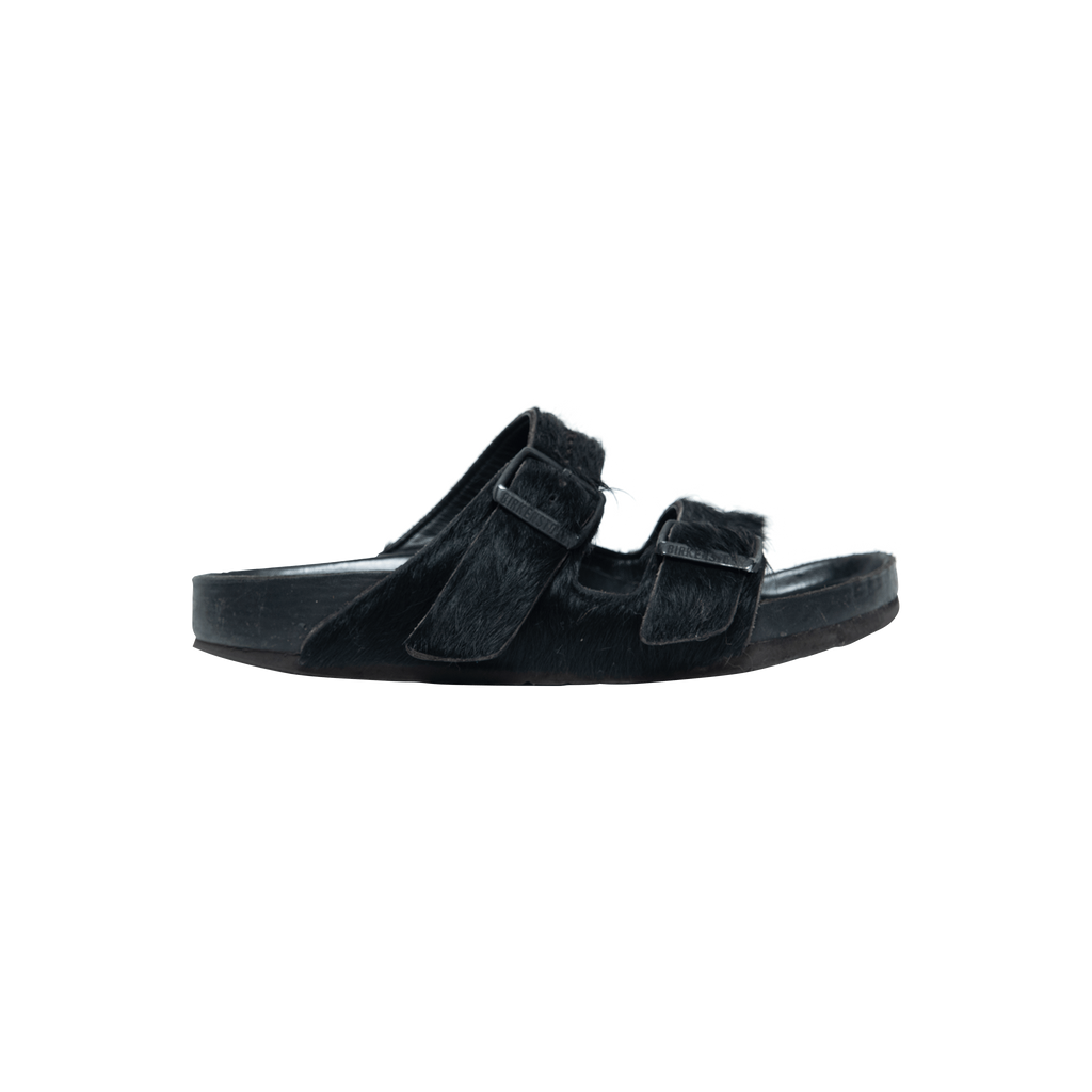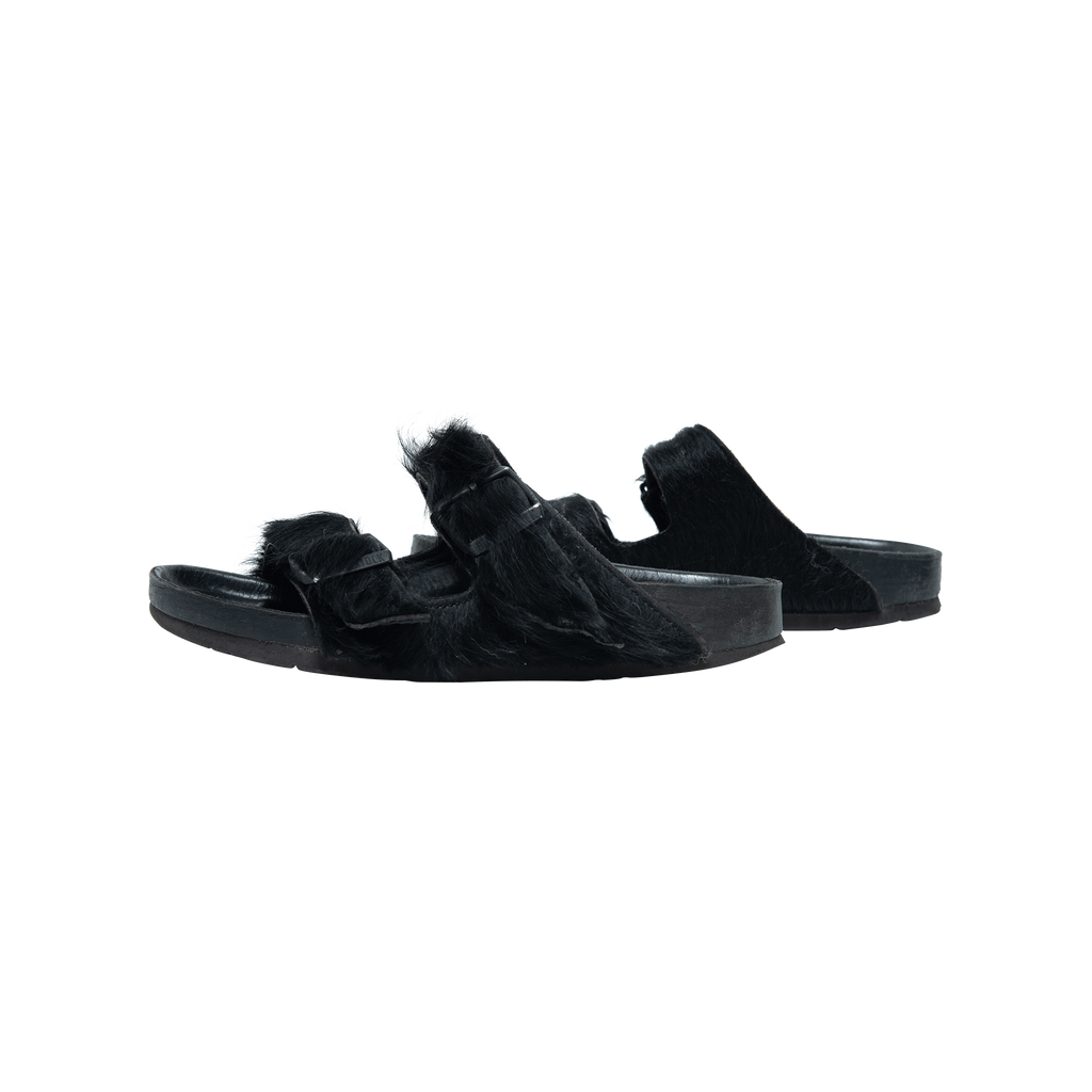Rick Owens x Birkenstock Black Pony Fur Sandals features classic double strap design with adjustable buckles and black pony fur.