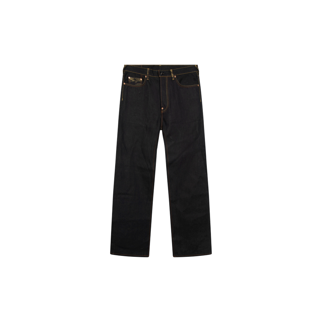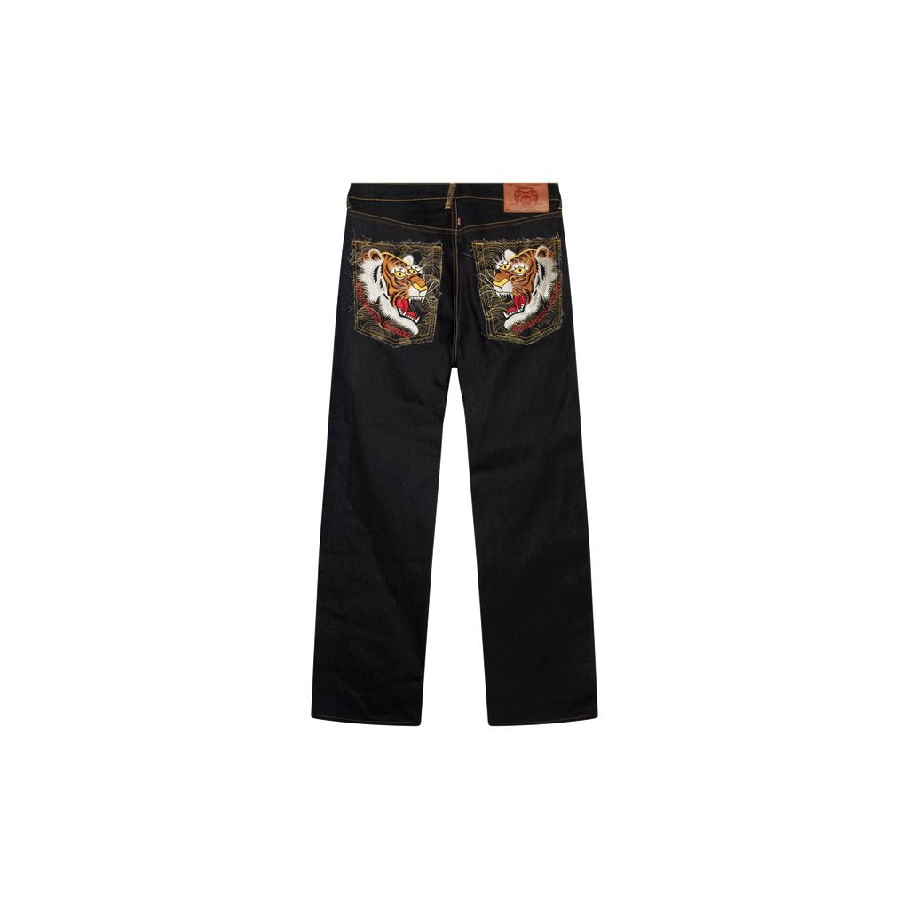 RMC Dark Wash Tiger Jeans features unwashed Japanese selvedge denim, 5 pocket styling, and tiger embroidery on back pockets.
