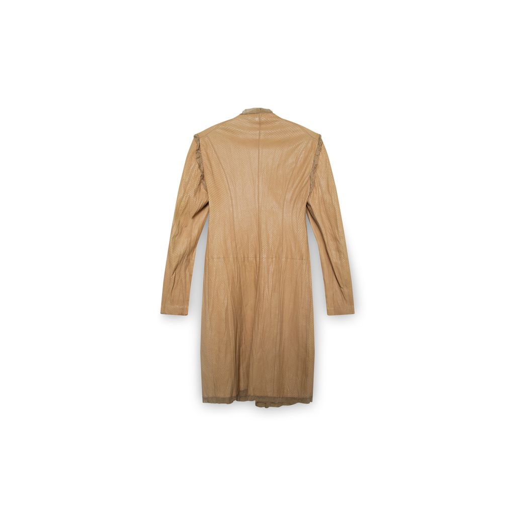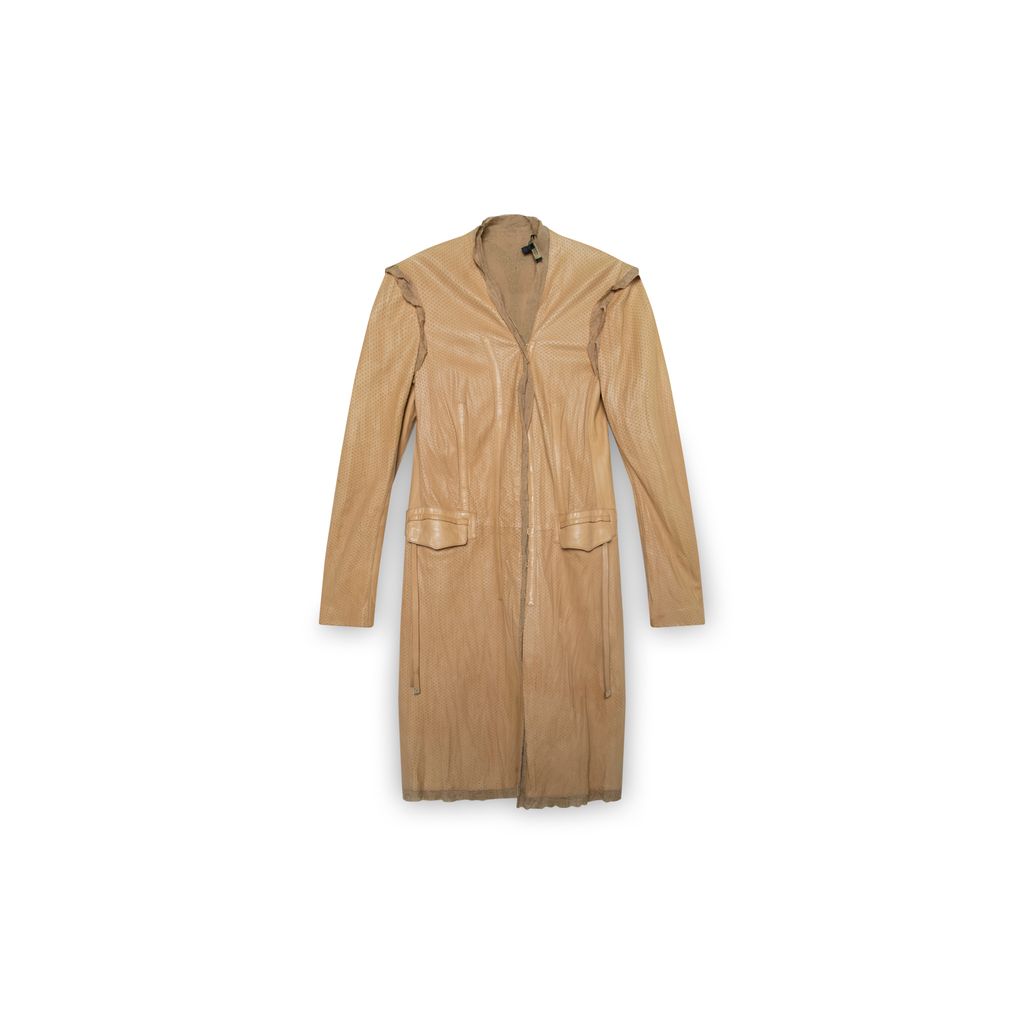 Roberto Cavalli leather perforated jacket features two front flap pockets, trimmings at center front, sleeve caps, and hem. coat has hook and eye closures at front.