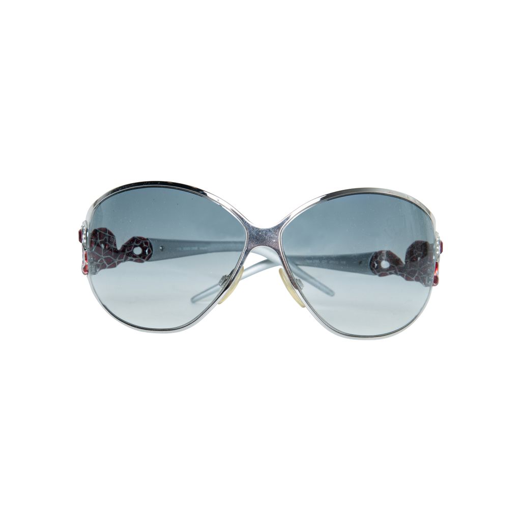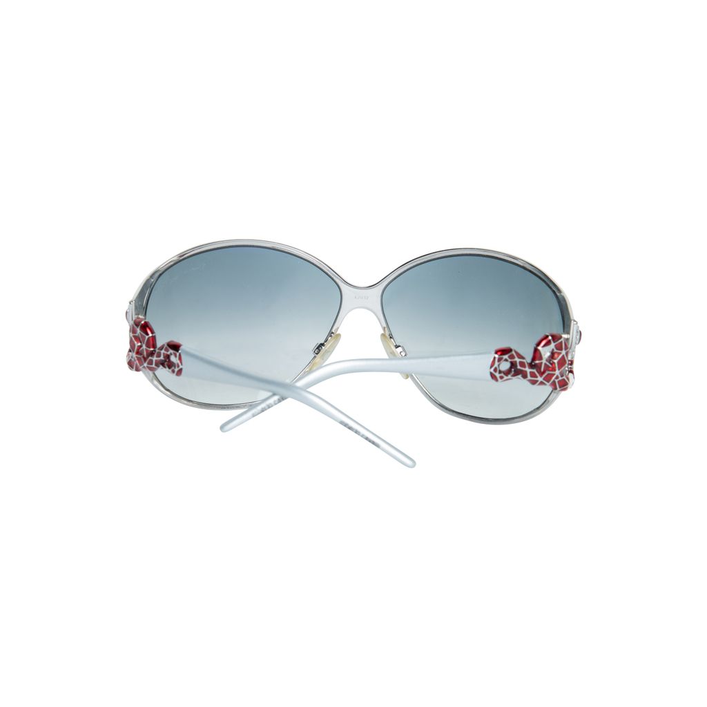 Roberto Cavalli oversized sunglasses features silver tone frame, gradient lens, resin embellishment at sides. Sunglasses comes with original case.