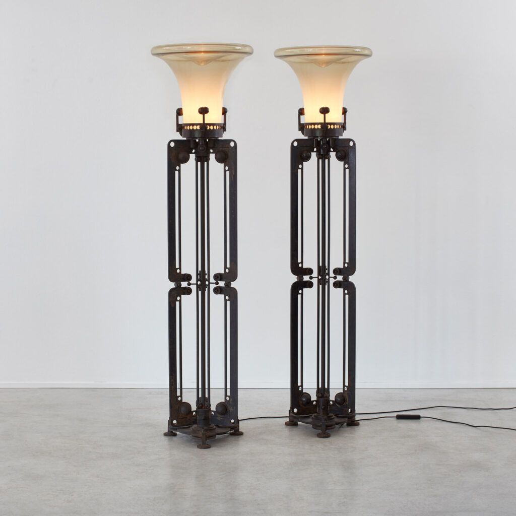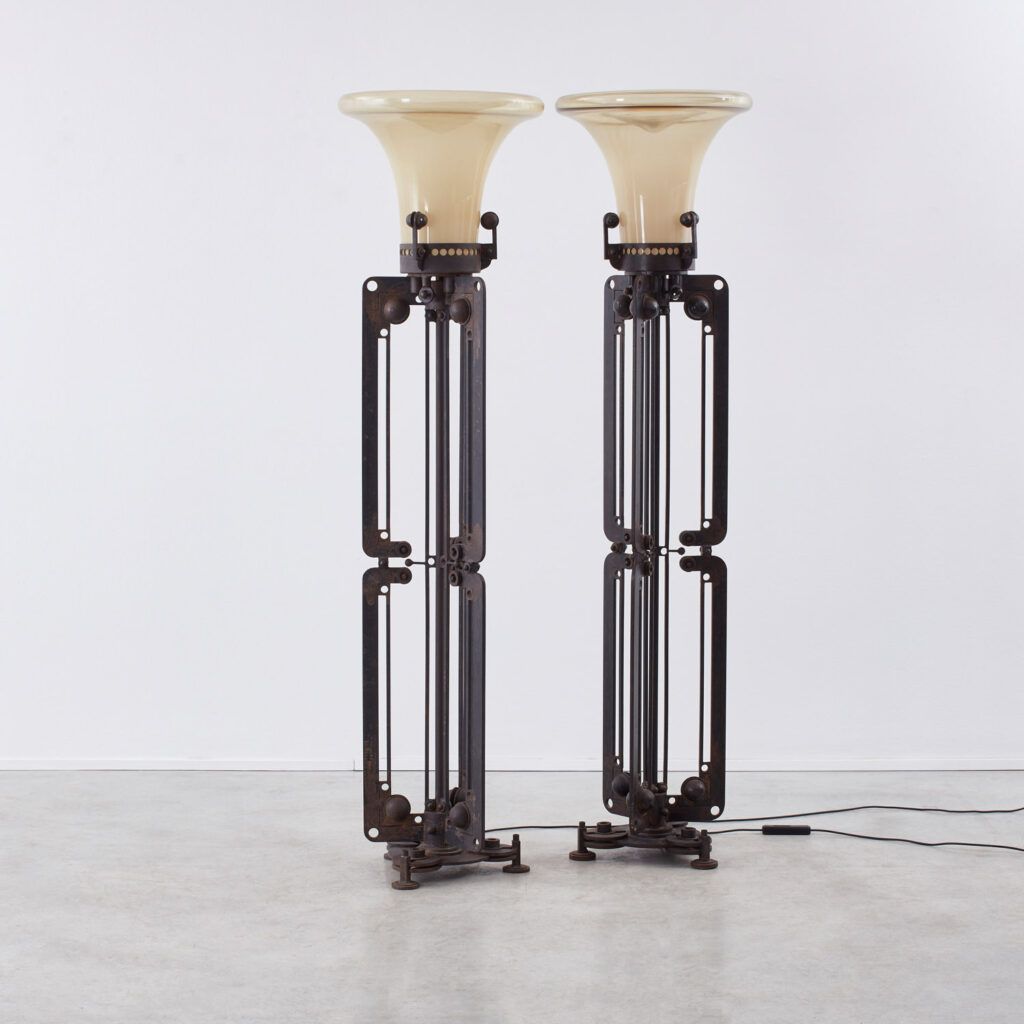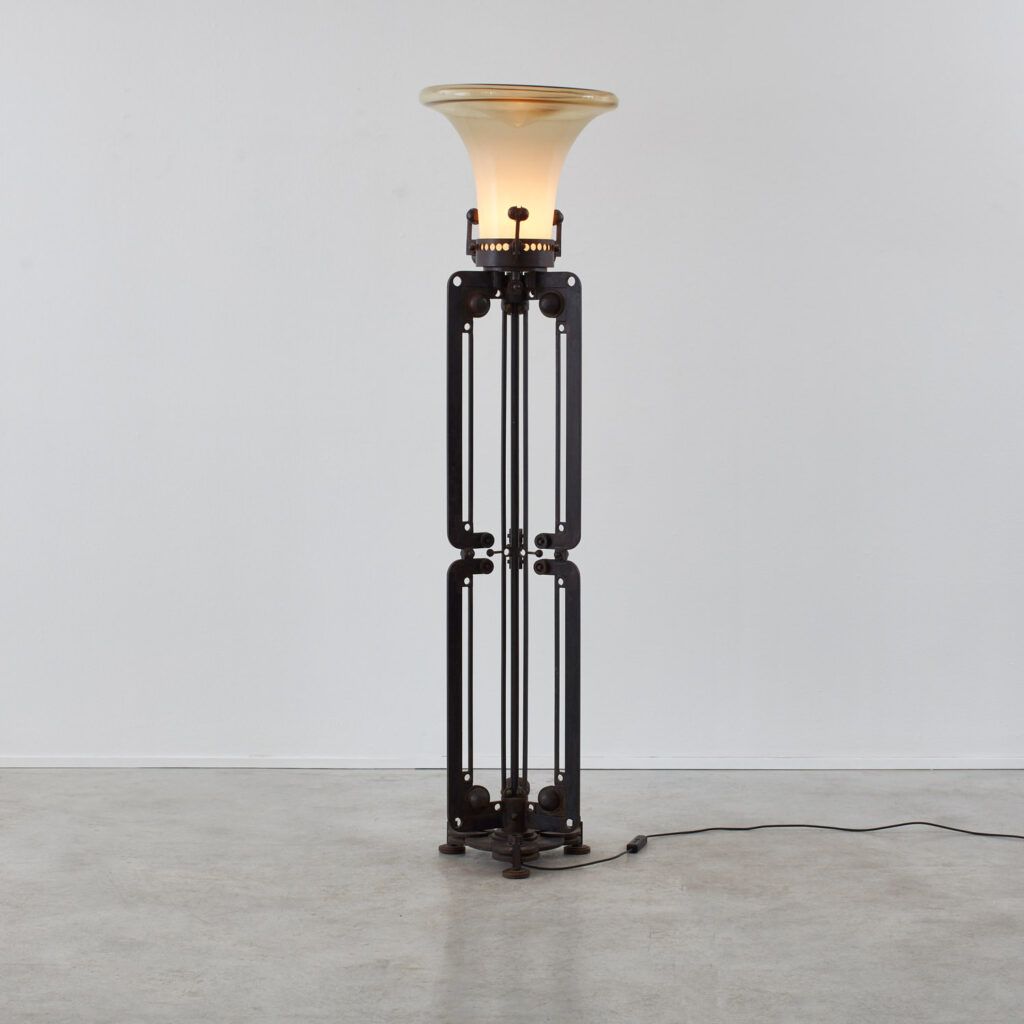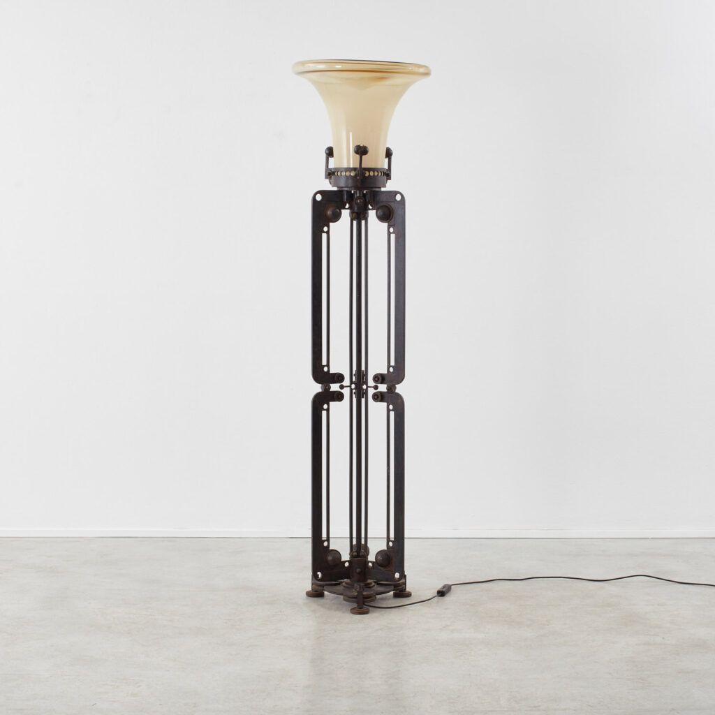 A funnel-shaped Murano glass shade emerges from a wrought iron contraption in this anachronistic piece by Roberto Fallani (b. 1937). The kinetic design suggests unknown mechanical function, with its language of bolts, ball bearings and fine levers.