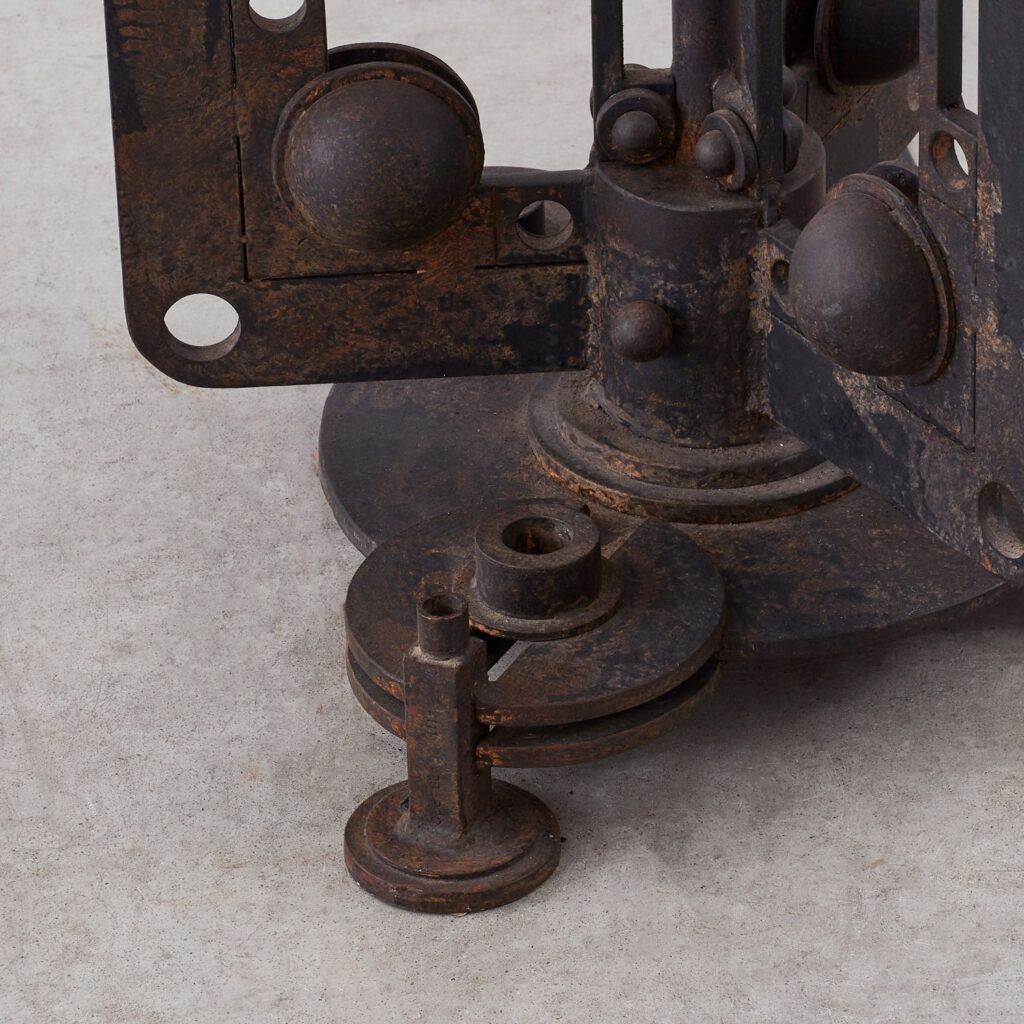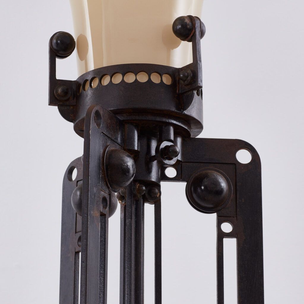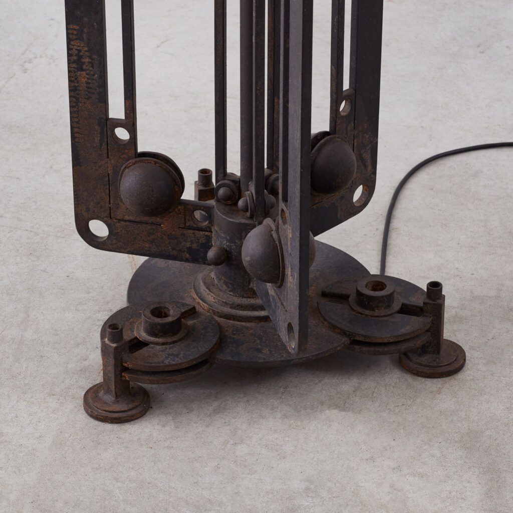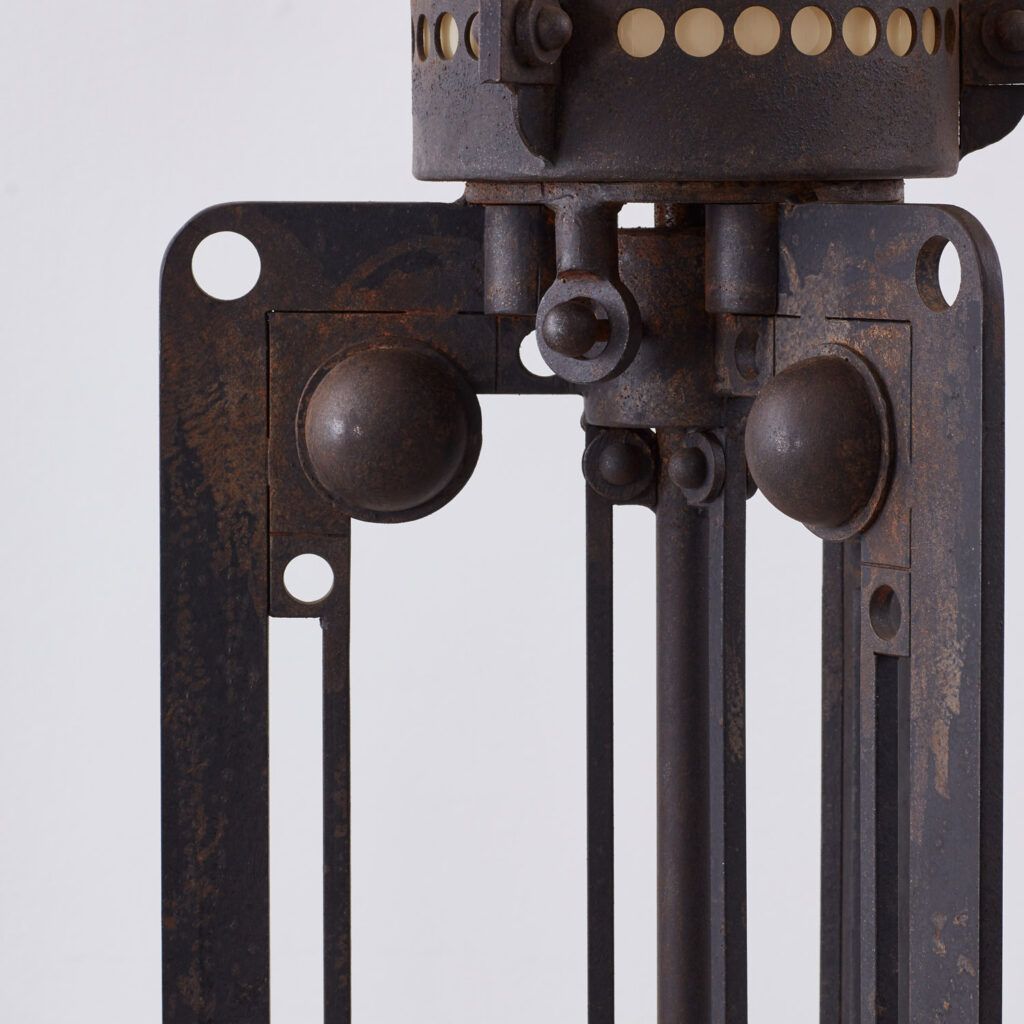 A funnel-shaped Murano glass shade emerges from a wrought iron contraption in this anachronistic piece by Roberto Fallani (b. 1937). The kinetic design suggests unknown mechanical function, with its language of bolts, ball bearings and fine levers.