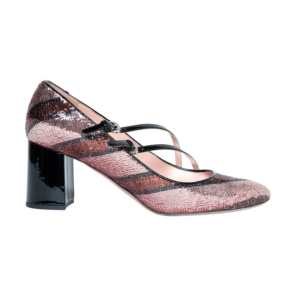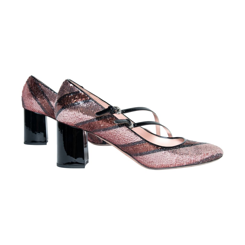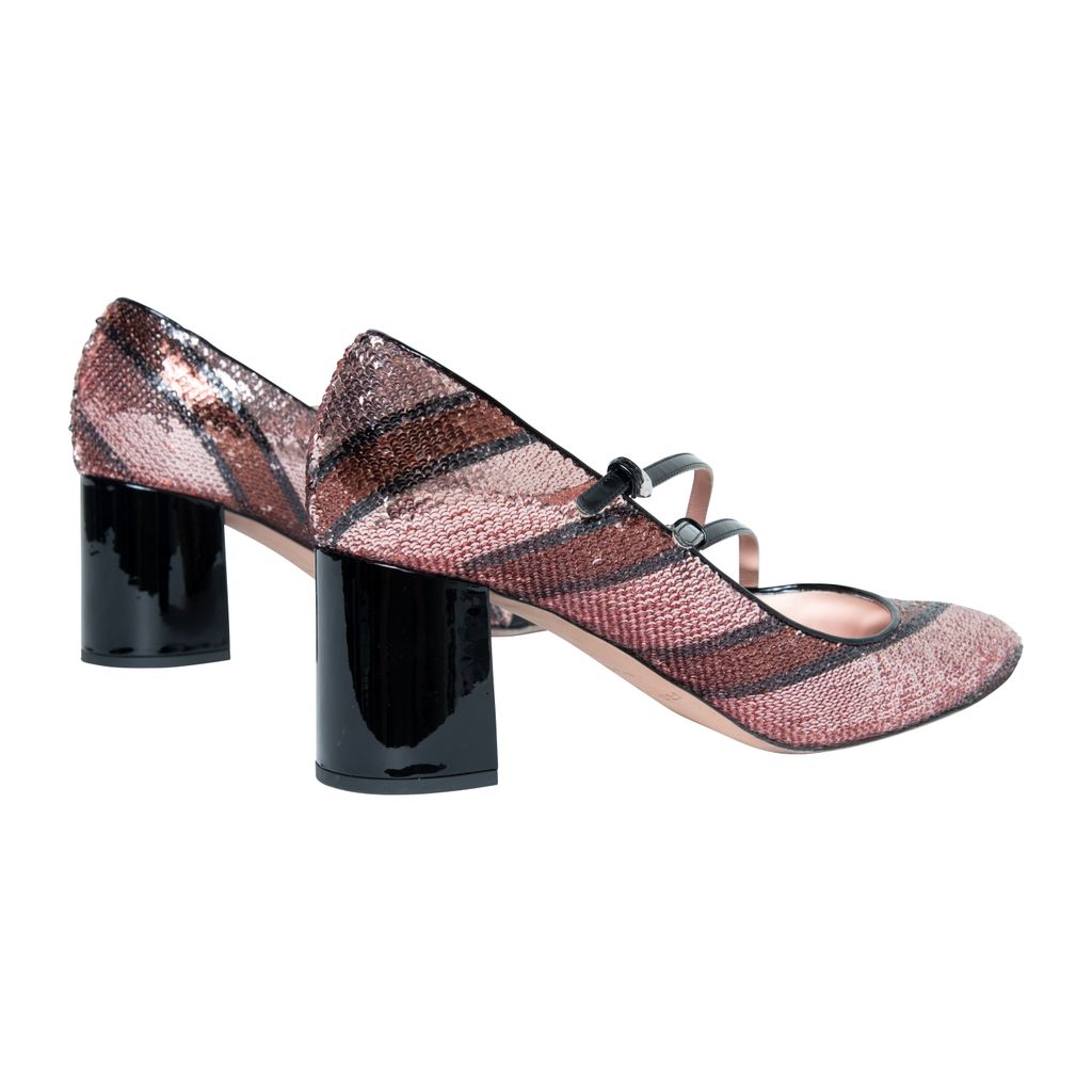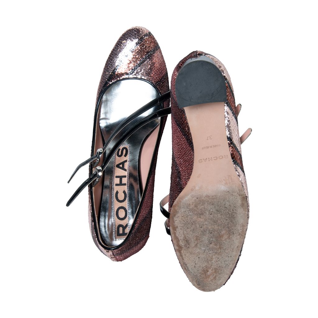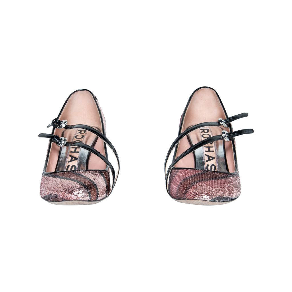 Rochas sequin heels features sequins in stripes pattern throughout, round toes, block heels, and double asymmetrical straps.