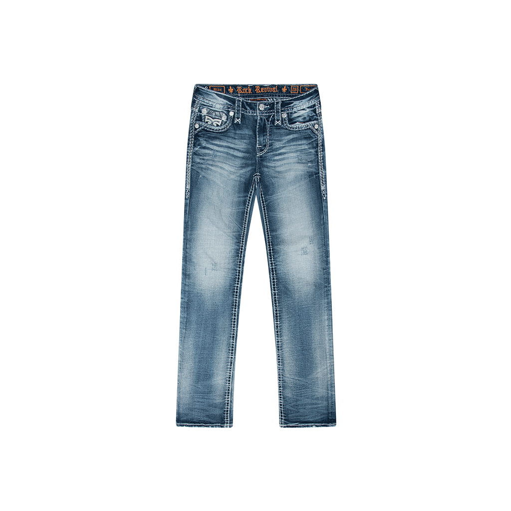 Rock Revival Jeans feature front zip and button closure, four pockets, and distress design.
