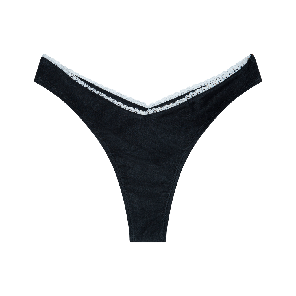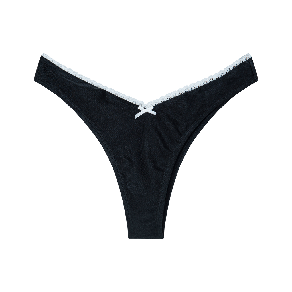 Rodeo Black Cheeky Bikini Bottom features V-silhouette, buttery shiny fabric, and white lace contrast stitching detail.