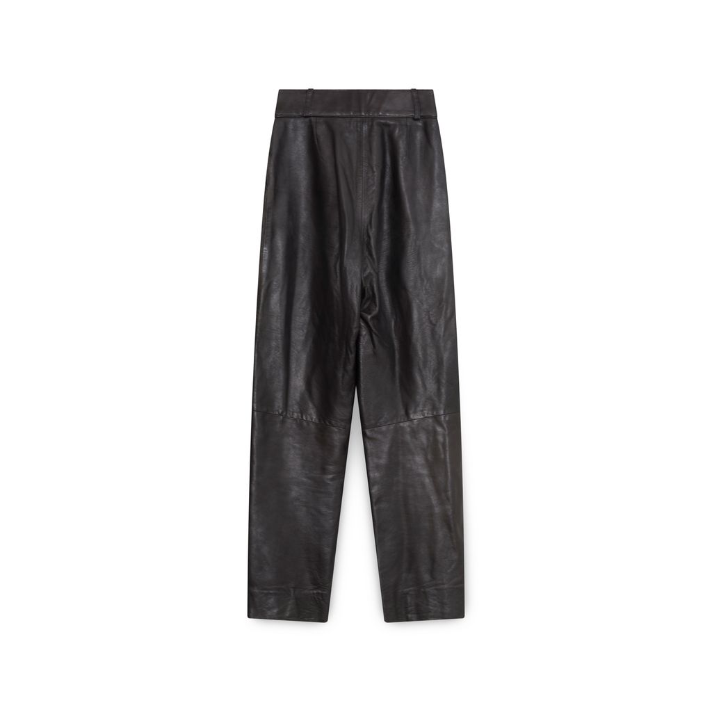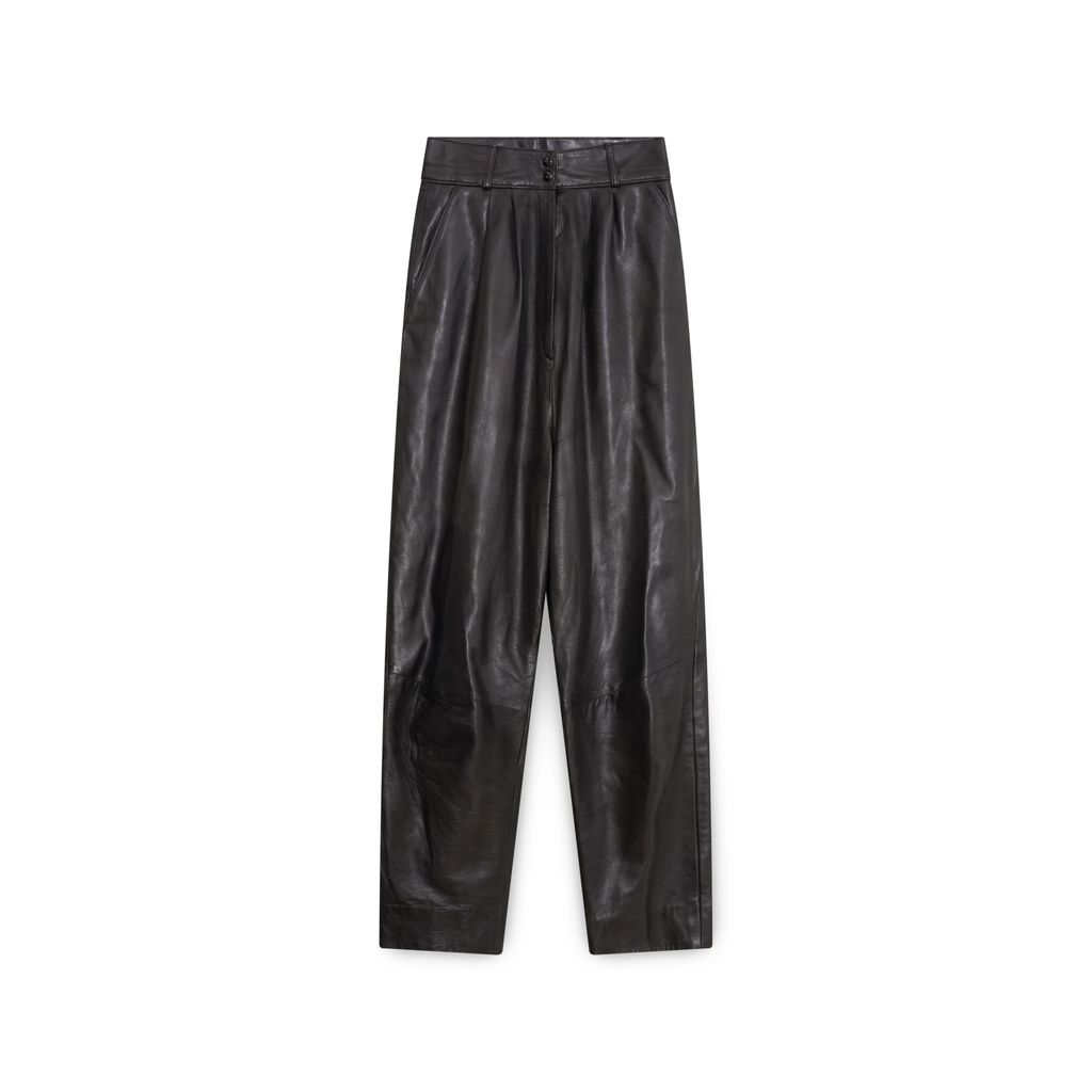 Roger Edwards Leather Pants features pleats in front, belt loops, zip-fly and button closure, side slit pockets.