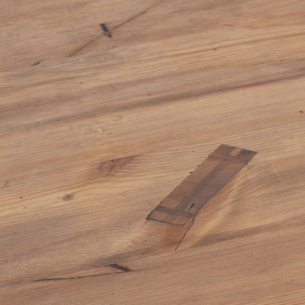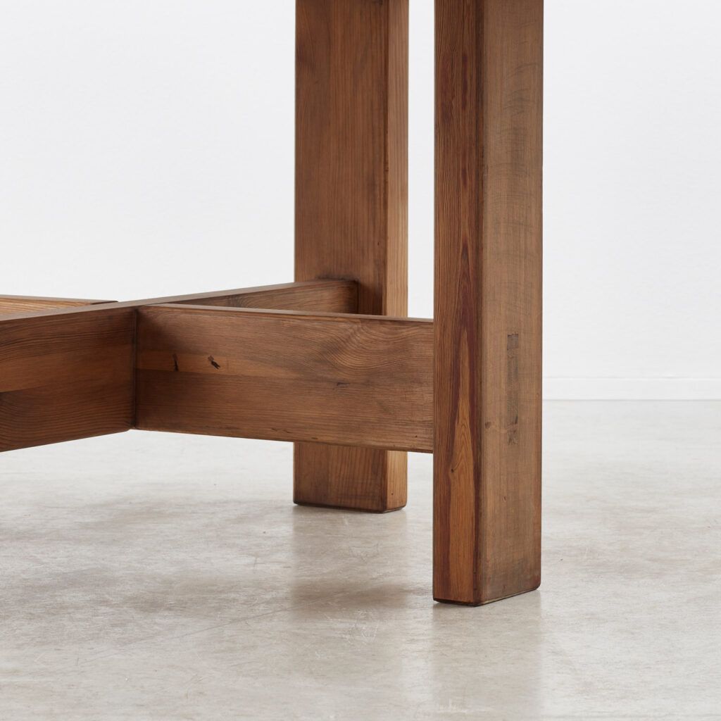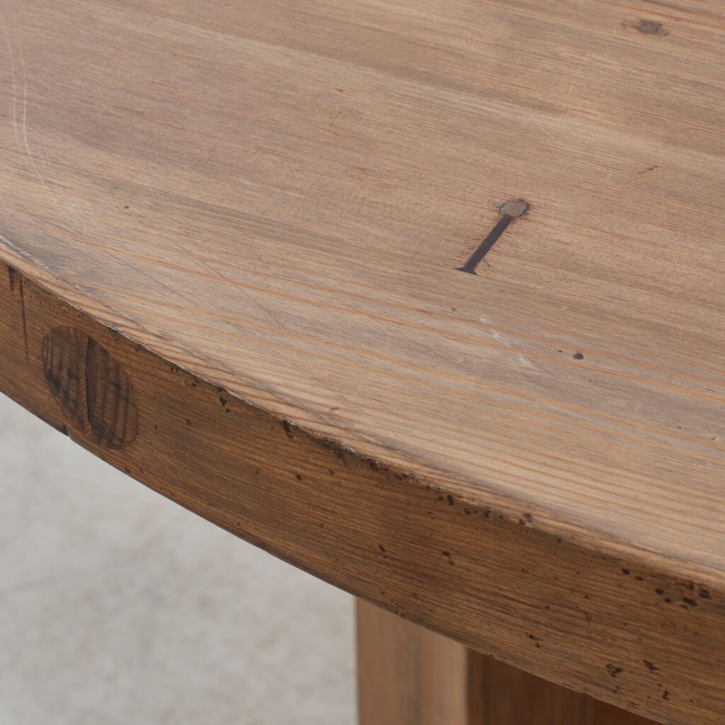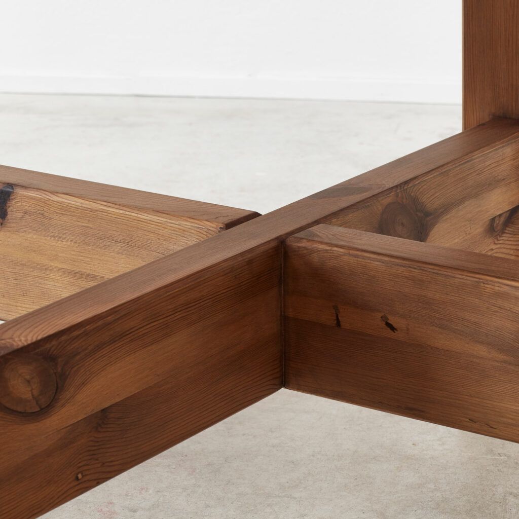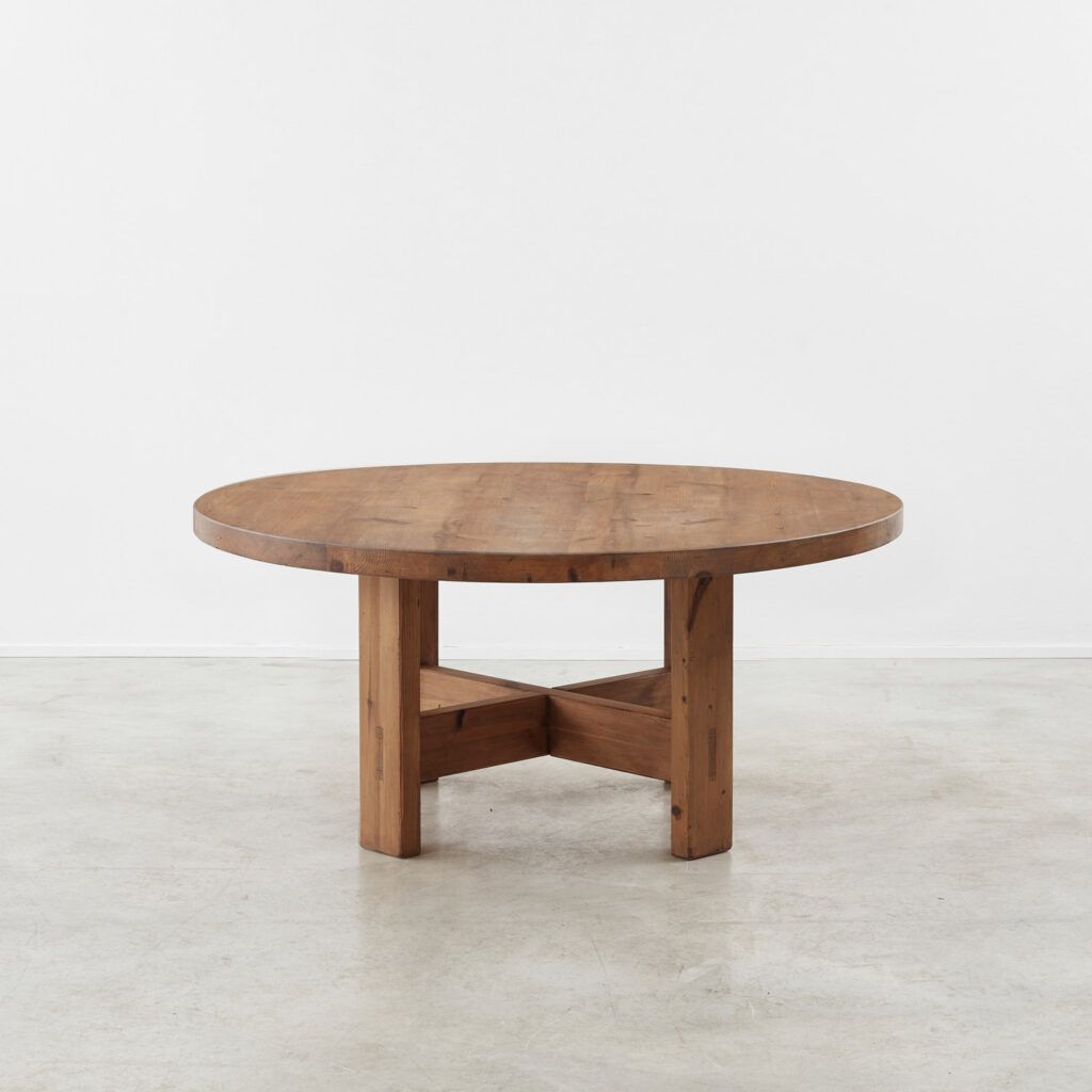 This circular dining table has a characteristic sturdiness, thanks to a criss-cross frame that supports the deep top. It’s a design that draws on considerable joinery heritage and takes pleasure in the execution. Natural knotting contrasts with the pale wood.