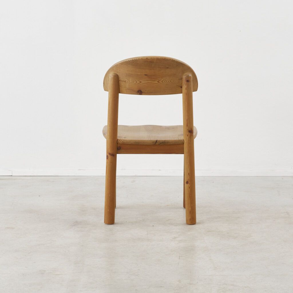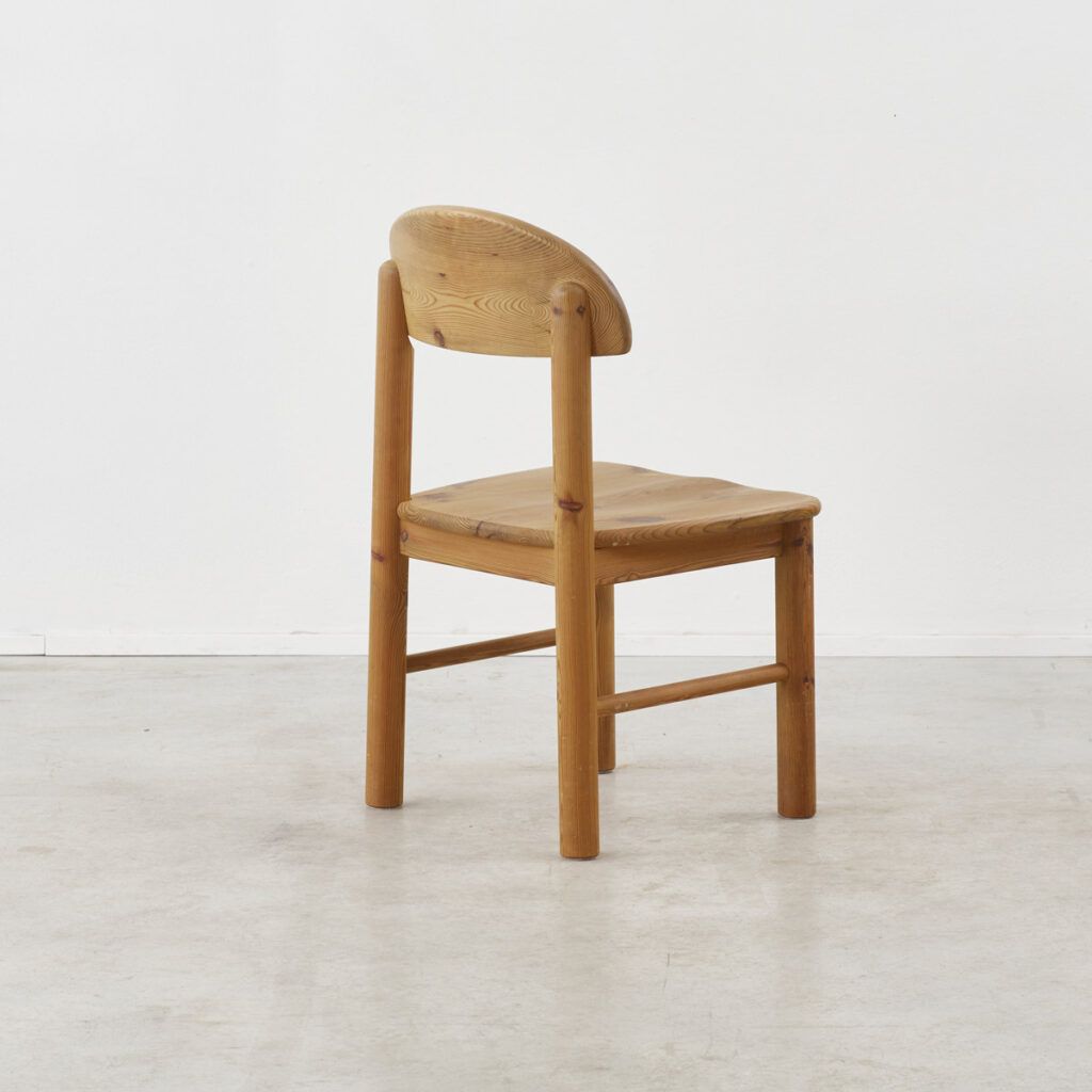 Drawing from the traditional Danish milking stool, The chairs by Rainer Daumiller are designed to support the sitter, with a slanted backrest cleverly sculpted to hold the natural contours of the body. Made of solid pine, the chairs are in good vintage condition, with some recent restoration to restore minor scratches to surface. Sold as a set of six.