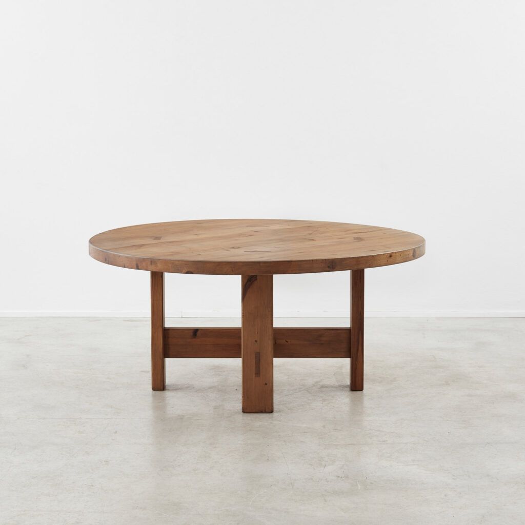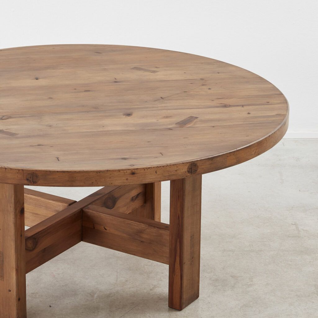 This pine circular dining table by Swedish furniture designer Roland Wilhelmsson has a characteristic sturdiness, thanks to a criss-cross frame that supports the deep top. It’s a design that draws on considerable joinery heritage and takes pleasure in the execution. Natural knotting contrasts with the pale wood. The table has been gently refinished in a cooler tone. There is some light age-related wear.