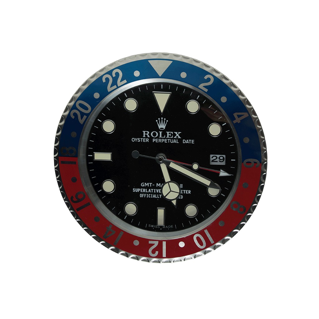Rolex Wall Clock - Pepsi Dealer Display is based on the Rolex GMT Master II series and features a functional datewheel and sweeping quartz movement powered by single AA battery.