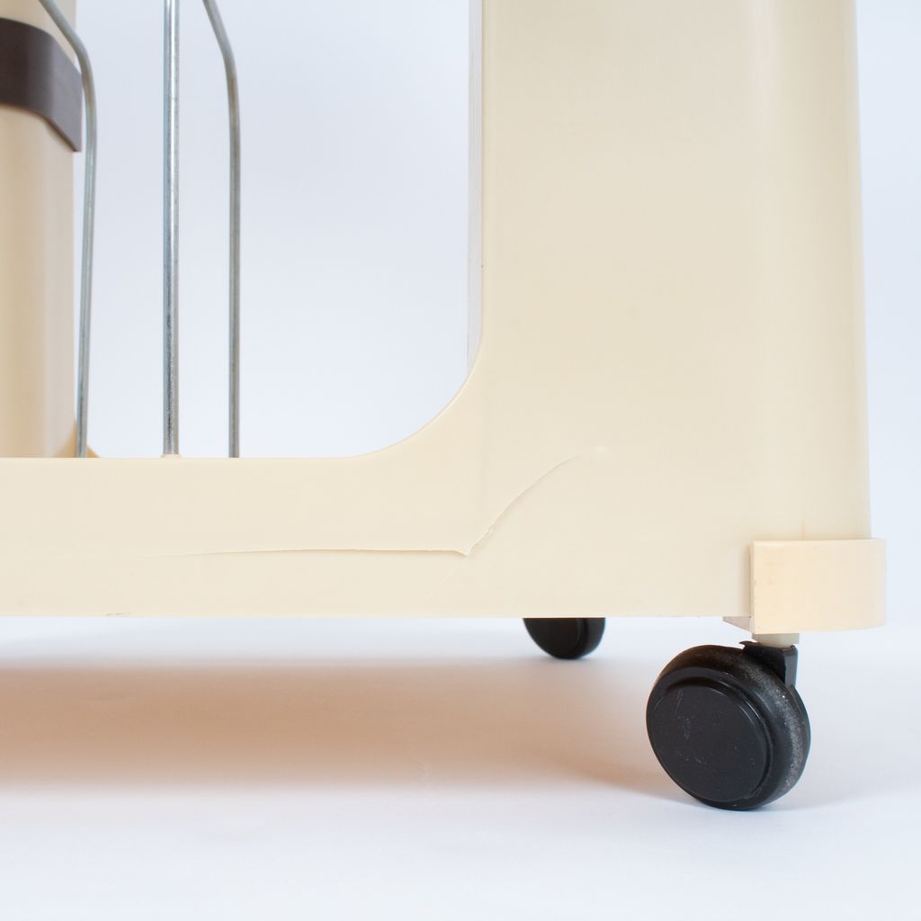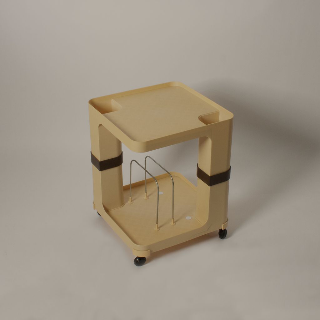 At the intersection of modern design and retro feel, the Emily Oberg curated furniture collection explores the essence of both through her own camera lens. This specific piece features a 1970's bar cart design, stacked design, magazine rack/record holders on bottom, cup/bottle holders on top corners, and minor signs of wear. Signs of wear include one missing rack piece on bottom (holes are covered with stickers) as well as crack on bottom trim near wheel as photographed.