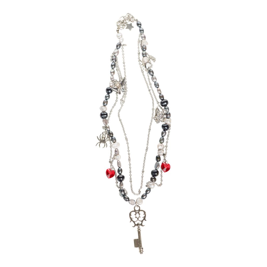 1/1 black and grey freshwater pearl necklace made with stainless chain, blood red gems and loads of silver charms.